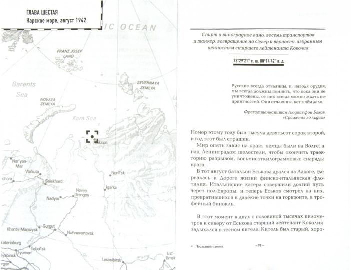 «Последний мамонт» - приключенческий роман о Русском Севере и Дальнем Востоке, где реальные научные сюжеты переплетаются с мистической атмосферой последних лет сталинской эпохи. Поиски последнего мамонта – с судьбами известных литературных героев, а истории советских полярников – с военным противостоянием в Арктике. Прекрасный и яростный мир, в котором есть место подвигу и в восемнадцадом, и в двадцатом веке, где девиз "Бороться и искать, найти и не сдаваться" актуален всегда.Это роман о настоящих героях, и, одновременно, энциклопедия, полная сведений о причудливом, часто мистическом Севере.