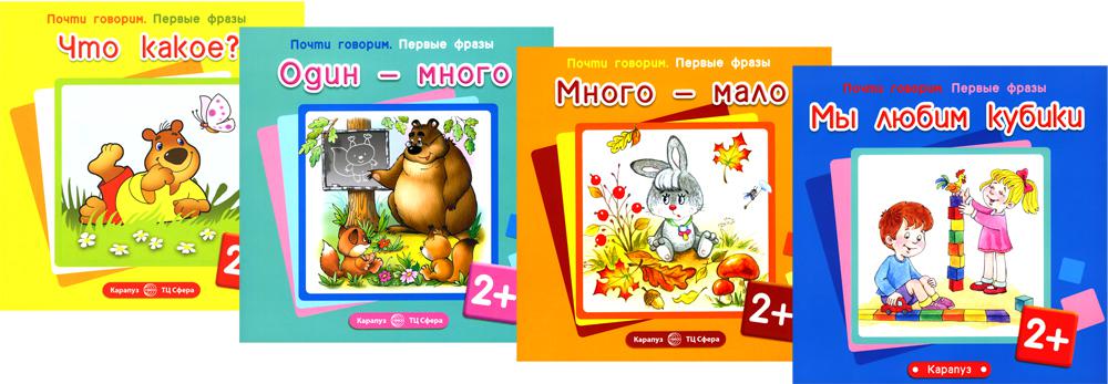 Комплект состоит из: Почти говорим. Первые фразы. Мы любим кубики (для детей 2-4 лет) Почти говорим. Первые фразы. Много - мало (для детей 2-4 лет) Почти говорим. Первые фразы. Один - много (для детей 2-4 лет) Почти говорим. Первые фразы. Что какое? (для детей 2-4 лет)
