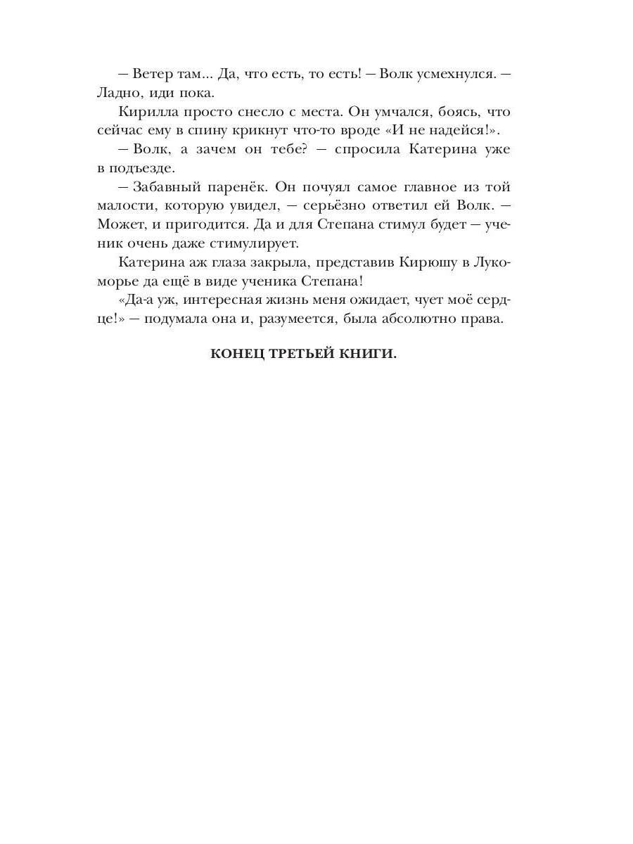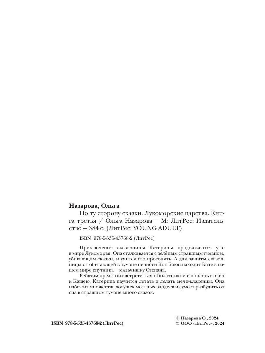 Handling time: 19 days Автор: Назарова О., «По ту сторону сказки. Лукоморские царства. Кн. 3»: Катерине приходится открыть ворота в Лукоморье прямо в школе из-за Черномора. Злобный карлик уносит Катерину в свой дворец и пытается подчинить её своей воле. Она узнает, откуда белка из сказки о царе Гвидоне брала золотые орехи, и сможет ощутить себя на месте царя Мидаса, который всё превращал в золото. Но, самым сложным для неё окажутся визиты в города и общение со сказочными царями, каждый из которых пытается руководить сказочницей. Катерине придётся спасать своего друга Волка от его прежней хозяйки, а Степана выручать из западни, в которую его отправит юная и злобная царевна. Сказочница научит петь Змея-Горыныча, и сможет уничтожить огромное волшебное зеркало Кащея, чтобы освободить пойманную ледяным злодеем Жар-Птицу. Походы в туман помогут разбудить множество сказок, а полёт на Стеклянную гору даст возможность спасти царевича, которого ягишна превратила в чудовище с драконье мордой. А расколдовав царевича, Катерине волей-неволей приходится искать ему невесту и придумывать сказку.