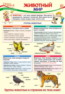 Плакат имеет удобный формат А3, каждый информационный блок выделен отдельным цветом для лучшего запоминания. Материал дает представление о животном мире в целом, о группах животных и их строении. Учащиеся узнают, какие существуют насекомые, рыбы, птицы, звери, познакомятся с их видами и жизнедеятельностью. Плакат не только наглядно иллюстрирует основные темы учебника, но и дополняет их интересной информацией, которая наверняка будет полезна учащимся.