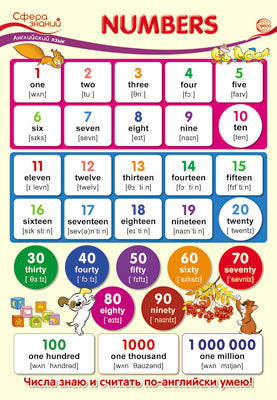 Плакат рекомендован для занятий по английскому языку с учащимися 1-х классов общеобразовательных организаций. Соответствует ФГОС начального общего образования по учебному предмету «Английский язык». На плакате последовательно размещены числа первого (от 1 до 10) и второго (от 11 до 20) десятков, затем приведены названия круглых чисел (30, 40, 50 и т.д.) и других разрядов более высокого порядка (100, 1000, 1 000 000). К каждому обозначению числа приведена транскрипция, которая позволяет правильно произнести и запомнить слово. Числа по данному наглядному пособию можно изучать как последовательно, так и вразнобой. Плакат яркий, привлекающий к себе внимание ребёнка. Имеет удобный формат А3, его легко разместить в классе или дома для изучения предложенного материала.