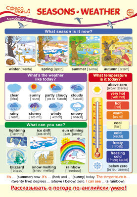 В плакате собраны наиболее употребительные вопросы тех, кто интересуется сезонными погодными явлениями, а также возможные варианты ответов на них. Все фразы сопровождаются транскрипцией, что поможет ребёнку не только пополнить свой словарный запас, но и научит его правильному произношению.