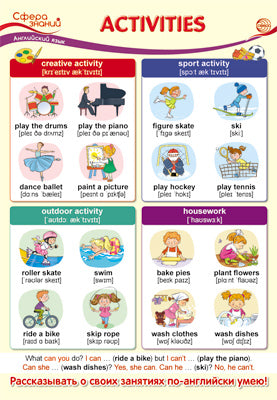 Плакат поможет быстро и наглядно освоить лексическую тему, связанную с различными видами занятий детей: творческими, спортивными, занятиями на свежем воздухе и по ведению домашнего хозяйства. Внизу плаката даётся активная речевая модель употребления слов и словосочетаний, что позволит научиться составлять предложения разных грамматических конструкций с глаголом can: вопросительные, утвердительные, отрицательные, а затем и целый рассказ.