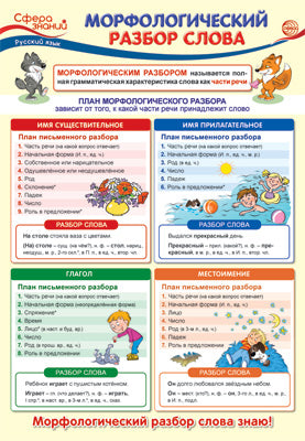 Плакат имеет удобный формат А3, каждый тематический блок выделен соответствующим цветом для лучшего запоминания и усвоения материала. Традиционно плакат начинается определением понятия «морфологический разбор слова» и заканчивается слоганом, формулирующим итоги работы по усвоению материала. Плакат дает представление о последовательности морфологического разбора частей речи, а также рекомендации по правильному разбору с различными примерами.