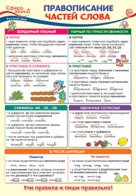 Плакат имеет удобный формат А3, каждое правило оснащено своим текстовым блоком и выделено отдельным цветом для лучшего запоминания. Плакат даст представление о правописании з–с на конце приставок перед гласными и согласными, в суффиксах -ик,-ек,-ок, на конце имен существительных после шипящих, поможет правильно написать слова с непроизносимым согласным и безударным гласным в корне слова. Каждый текстовой блок представлен примерами, которые можно использовать как алгоритм для работы с другими