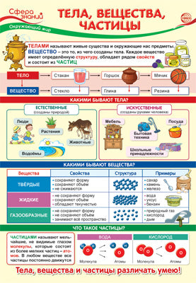 Плакат познакомит с естественными и искусственными телами, твердыми, жидкими и газообразными веществами, а также частицами, молекулами и атомами. Примеры, характеризующие основные понятия, помогут учащимся разобраться в свойствах и структуре тел, веществ и частиц.