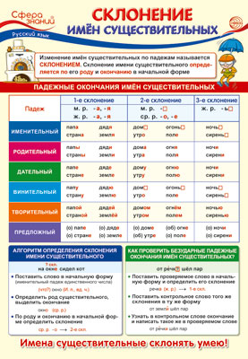 Плакат имеет удобный формат А3, каждый этап разбора имеет свой текстовой блок и выделен отдельным цветом для лучшего запоминания. Плакат познакомит с падежными окончаниями имен существительных, их родом и склонением, научит проверять безударные падежные окончания, даст алгоритм определения склонения имени существительного.