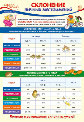 Плакат имеет удобный формат А3, каждое правило оснащено своим текстовым блоком и выделено отдельным цветом для лучшего запоминания. Плакат даст представление о личных местоимениях, познакомит с изменениями по падежам и числам местоимений 1-го и 2-го лица, а местоимений 3-го лица – по родам, падежам и числам.