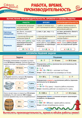 Плакат даст представление о понятиях «работа», «время», «производительность», алгоритмах их вычисления, познакомит с основными формулами, поможет выработать и закрепить навыки необходимых математических действий. Для удобства каждый текстовой