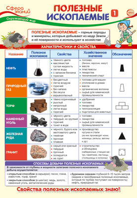 формулировка темы, в конце — представлен традиционный слоган, раскрывающий итоги работы. Плакат даст представление о полезных ископаемых, познакомит с их характеристиками и свойствами. Учащиеся узнают о хозяйственном значении нефти, природного газа, торфа, каменного угля, железной руды, гранита, познакомятся с их условными обозначениями и