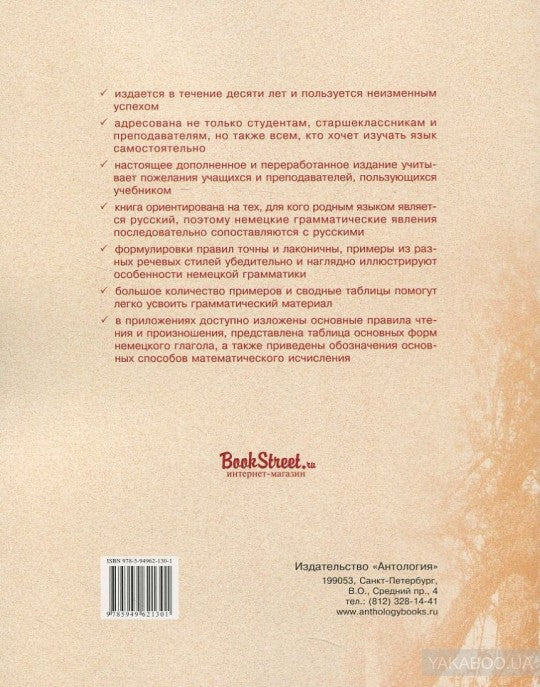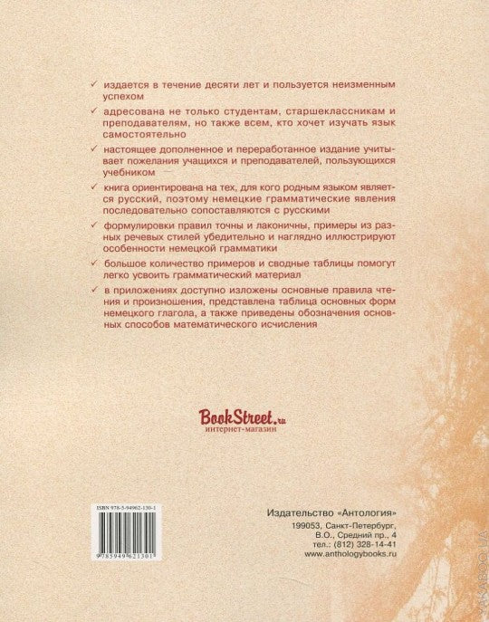Предлагаемая книга представляет собой наиболее полное справочное пособие по грамматике немецкого языка, в котором основные особенности его грамматического строя представлены в последовательном систематическом изложении. Каждое грамматическое явление иллюстрируется значительным количеством примеров, принадлежащих различным стилям речи, в том числе заимствованным из повседневного бытового, а также делового общения. По всей книге последовательно проводится сопоставление явлений немецкой грамматики с их функциональными соответствиями в русском языке, что значительно облегчает учащимся процесс овладения живым, естественным и грамматически корректным немецким языком.
