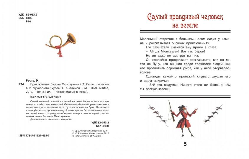 Handling time: 19 days Знаменитая книга Рудольфа Эриха Распе (1736-1794) о невероятных приключениях "самого правдивого человека на Земле", великолепного барона Мюнхаузена, пересказанная для детей Корнеем Ивановичем Чуковским (1882-1969), входит в золотой фонд отечественной детской литературы. Несомненным украшением книги являются весёлые и тоже "очень правдивые" иллюстрации Сергея Алимова.Для младшего школьного возраста.