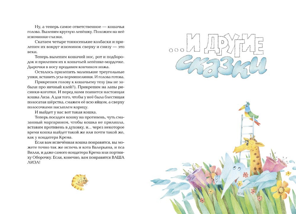 Прочитав эту книгу маленькие читатели не только узнают о приключениях кошки Лизы, но и познакомятся с героями других сказок Виктора Лунина: грустной тучкой и не умеющим читать слонёнком, смелым ёжиком и жирафом, который так хотел поиграть в прятки… А ещё — внимательно изучив рецепт, можно будет самому (или с мамой) испечь из теста кошку… Или слонёнка и телёнка? Ежа и лису? Тучку и кораблик?.. Да кого захочется! Стоит лишь немного пофантазировать.