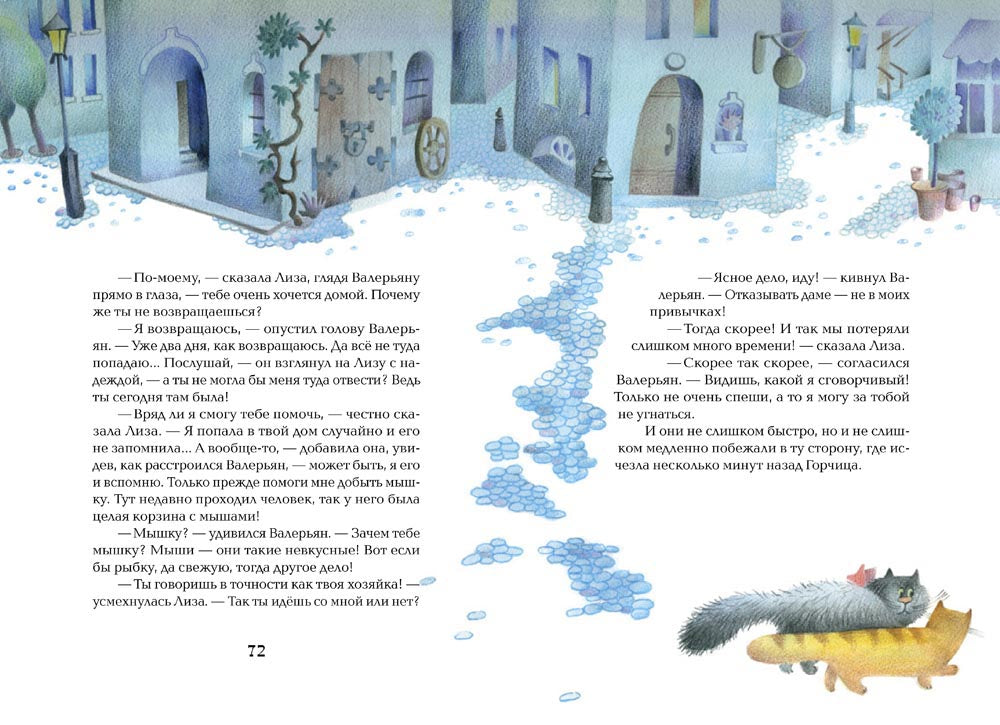 Десять лет пролежала сказка в столе. Доделал я её только тогда, когда у нас в семье появился кот Марсик, рыжий красавец, белоснежная манишка на груди, белые носочки на лапах, глаза — зеленоватые крыжовинки. Он в одно мгновение взлетал на верхушку книжного шкафа, сбрасывая на пол всё, что попадалось на пути. А ещё пытался вместе со мной печатать на пишущей машинке и научился будить меня по ночам, включая лапой свет, когда ему хотелось есть. Я подглядел все его движения, все хитрости и повадки и наделил ими героев повести, Лизу и Валерьяна. И только тут наконец сказка ожила по-настоящему. В этой книге вы прочтёте не только саму сказку, но и песни всех её главных героев.