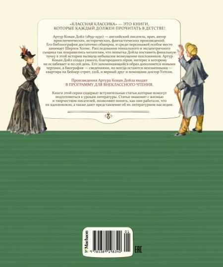 Handling time: 14 days Артур Конан Дойл (1859-1930) - английский писатель, врач, автор приключенческих, исторических, фантастических произведений. Его библиография достаточно обширна, и среди персонажей особое место занимает Шерлок Холмс. Расследования гениального и эксцентричного сыщика так понравились читателям, что попытка Дойла поставить финальную точку в этой истории вызвала небывалое возмущение поклонников. Артур Конан Дойл создал умного, благородного героя, интерес к которому не ослабевает и по сей день. Его запоминающийся образ дополняется новыми чертами, а биография - сведениями, но всегда остаются неизменными - квартира на Бейкер-стрит, 221Б, и верный друг и помощник доктор Уотсон.Для среднего школьного возраста.