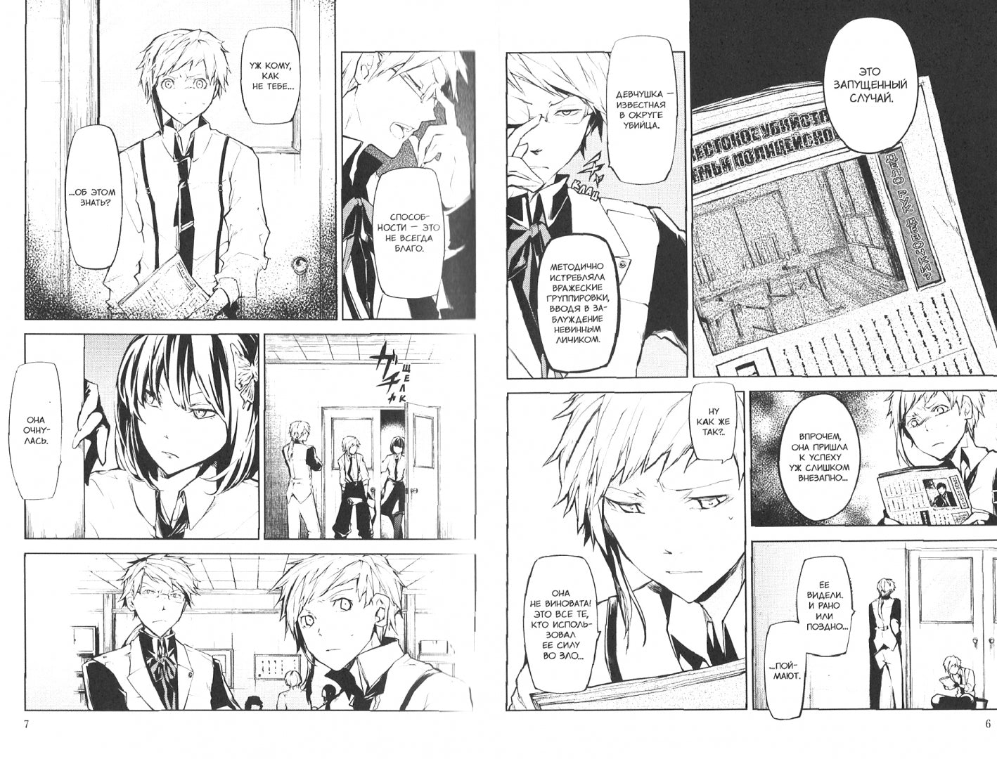 Handling time: 25 days Кёка Идзуми воспротивилась приказу мафии и едва не погибла по собственной вине. Ацуси Накадзима спас ее да еще тофу накормил - все ради того, чтобы выведать ценные сведения… Только мир и покой продлились недолго: Акутагава разработал коварный план похищения Ацуси. Тем временем перед закованным в цепи Дадзаем предстал бывший товарищ-мафиози, а теперь его недруг - Тюя Накахара. Дадзай Осаму против Тюи Накахары, Рюноскэ Акутагава против Ацуси Накадзимы… К чему приведет крупный конфликт между вооруженными детективами и мафией?В книгу вошли 3-й и 4-й тома оригинальной манги, главы 9-16. Здесь завершается арка "Портовая мафия", начинается арка "Гильдия". Пять причин купить 1Крепкий детектив с мировыми заговорами, погонями и правительственными шпионами, но у всех есть сверхспособности, и все это по 2 тома в 1 книге. 2Все персонажи - знаменитые писатели и поэты со всего света: Осаму Дадзай, Тюя Накахара, Марк Твен, Федор Достоевский, Николай Гоголь - только начало списка. 3Если ребенок не любит классику, но фанатеет по аниме и манге, после этой серии он точно начнет читать. 4Есть аниме-адаптация от студии Bones, полнометражные фильмы, театральные постановки. 5В 2014 году манга вошла в ТОП-10 изданий, рекомендованных книжными магазинами по всей Японии (по версии Nippon Shuppan Hanbai).