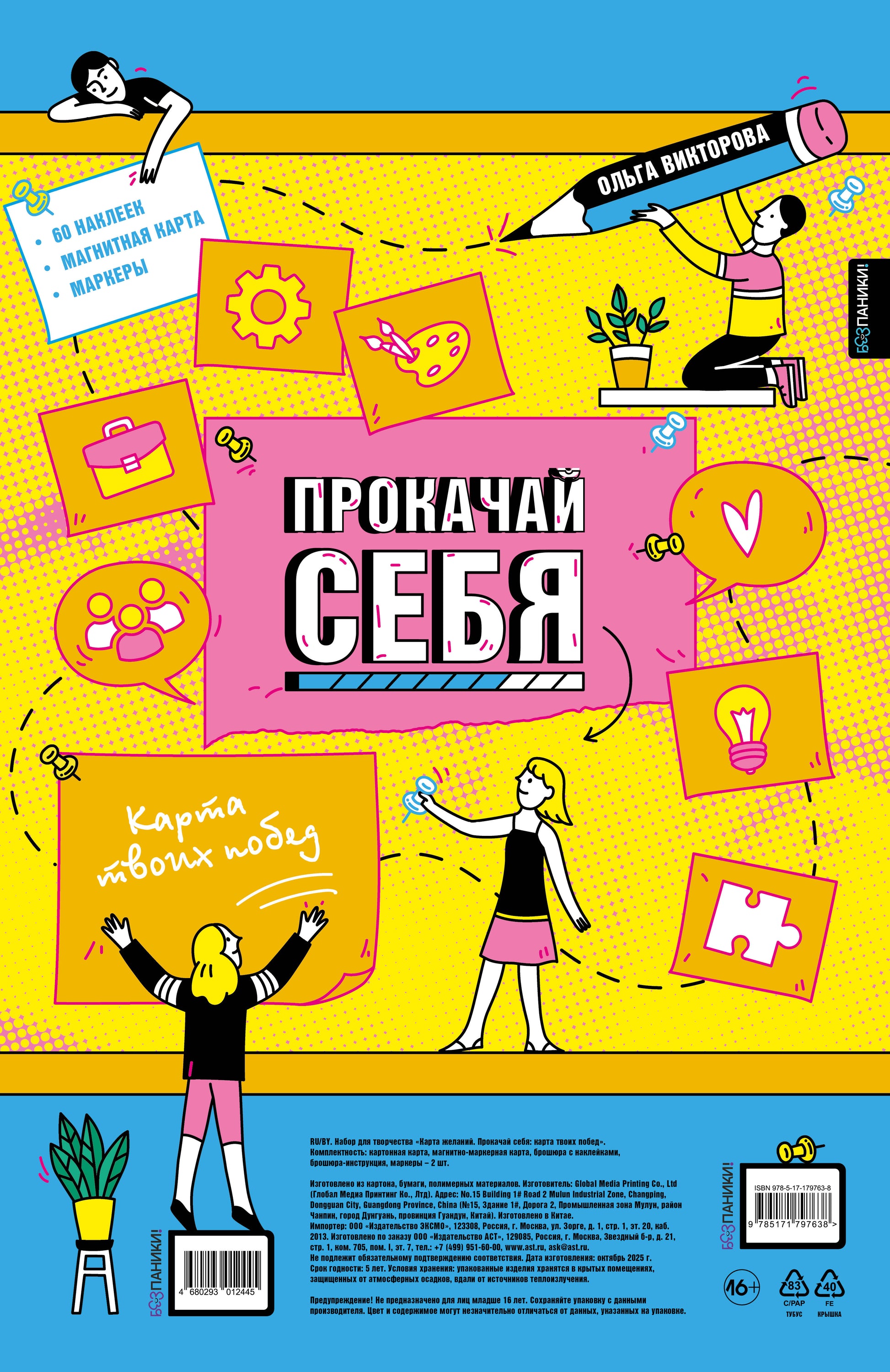 Handling time: 14 days Ольга Викторова — клинический психолог, работает с детьми и их родителями в ДокДети и ДокМед. Помогает улучшить качество жизни и справиться со сложностями во взаимоотношениях с окружающими людьми, негативными эмоциями, тревожными и депрессивными мыслями."Прокачай себя" — это интерактивная система, которая объединяет мощь визуализации с практикой конкретных действий. С ее помощью ты сформулируешь желание так, чтобы Вселенная тебя услышала, прокачаешь осознанность и настроишь внутренний радар на возможности, совершишь первый шаг к цели и запустишь цепь волшебных событий.Внутри ты найдешь все необходимое для создания своей идеальной реальности:• Карта желаний из плотного картона для визуализации глобальных целей и самых заветных желаний.• Брошюра с красочными картинками и наклейками, которые помогут тебе сделать карту яркой и индивидуальной.• Инструкция и упражнения, помогающие проработать цели, проанализировать прогресс и записать свои мысли.• Магнитная карта для фиксации небольших, но важных желаний, ведь волшебство начинается с малого! Для того чтобы притянуть крупные цели, важно исполнить хотя бы одну маленькую мечту. Часто мы забываем о таких простых радостях, как поход в кино, обед в кафе или покупка новых кроссовок, а ведь именно они наполняют жизнь яркими красками и дают ощущение, что мечты сбываются. Записывай их на магнитной карте, вычеркивай по мере исполнения и чувствуй магию каждого прожитого дня!• Два цветных маркера для записи.