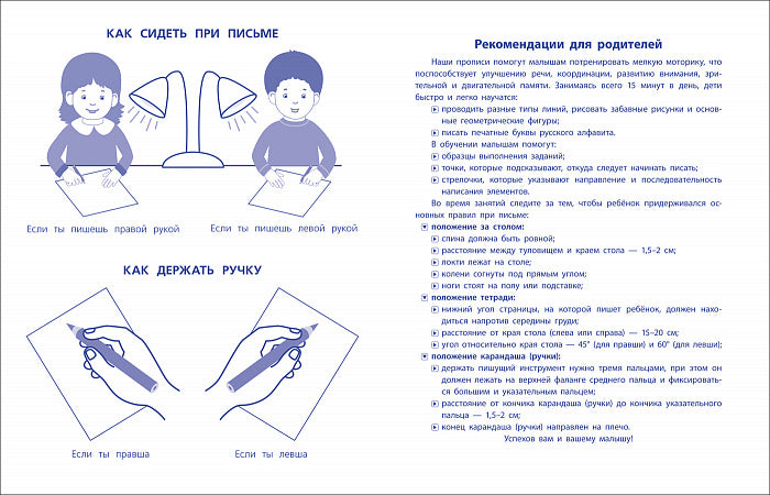 Прописи данной серии представляют собой полную программу подготовки руки к письму. Занимаясь по ним, ребенок научится писать буквы и цифры, штриховать, проводить линии и рисовать узоры. Прописи можно использовать по отдельности или в комплексе, отрабатывая формирующиеся умения. Систематическое выполнение упражнений разовьет мелкую моторику рук ребенка, координацию движений, сформирует образы букв и цифр.
