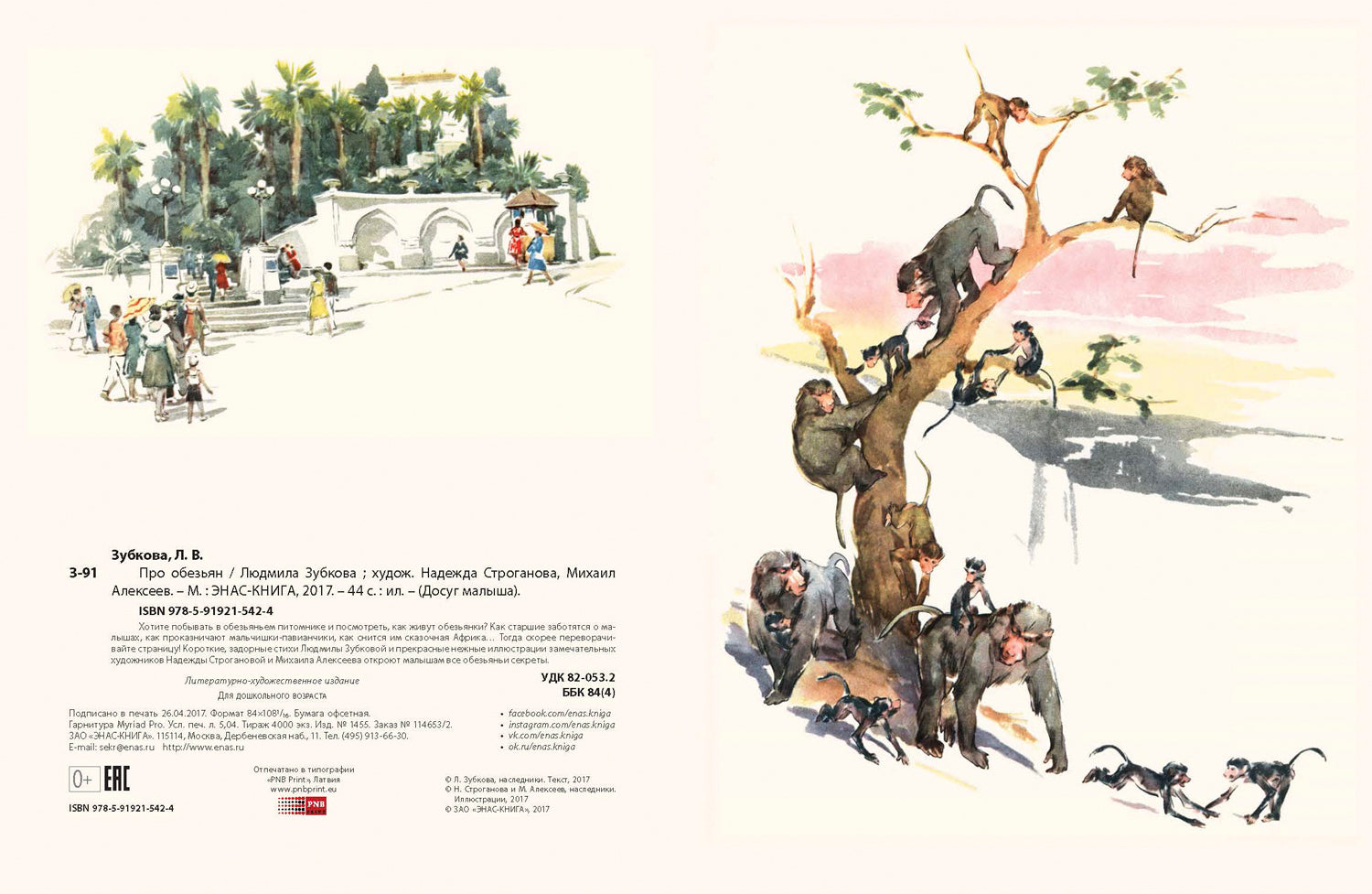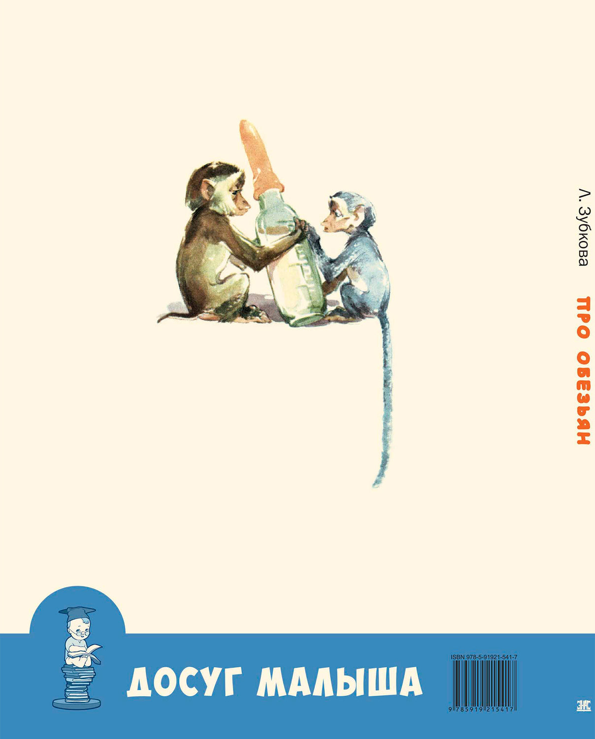Про обезьян. Зубкова Л.В. Досуг малыша Хотите побывать в обезьяньем питомнике и посмотреть, как живут обезьянки? Как старшие заботятся о малышах, как проказничают мальчишки-павианчики, как снится им сказочная Африка… Тогда скорее переворачивайте страницу! Короткие, задорные стихи Людмилы Зубковой и прекрасные нежные иллюстрации замечательных художников Надежды Строгановой и Михаила Алексеева откроют малышам все обезьяньи секреты.