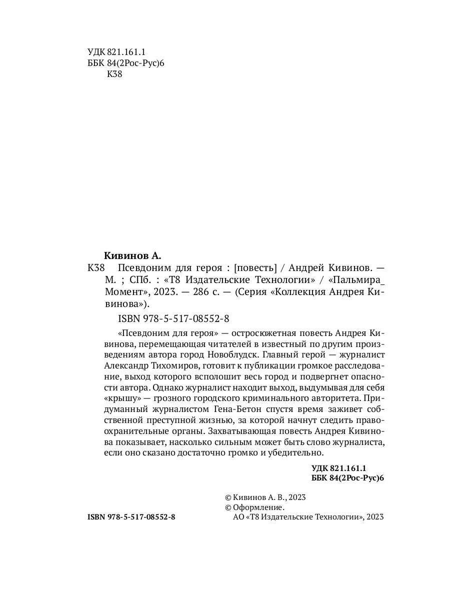Handling time: 19 days Автор: Кивинов А.В., «Псевдоним для героя: повесть»: "Псевдоним для героя" - остросюжетная повесть Андрея Кивинова, перемещающая читателей в известный по другим произведениям автора город Новоблудск. Главный герой - журналист Александр Тихомиров, готовит к публикации громкое расследование, выход которого всполошит весь город и подвергнет опасности автора. Однако журналист находит выход, выдумывая для себя "крышу" - грозного городского криминального авторитета. Придуманный журналистом Гена-Бетон спустя время заживет собственной преступной жизнью, за которой начнут следить правоохранительные органы. Захватывающая повесть Андрея Кивинова показывает, насколько сильным может быть слово журналиста, если оно сказано достаточно громко и убедительно.