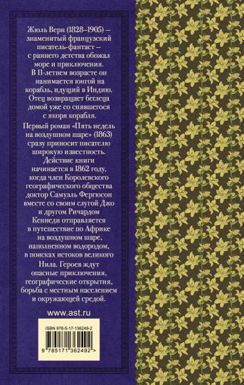 Handling time: 14 days Жюль Верн (1828-1905) - знаменитый французский писатель-фантаст - с раннего детства обожал море и приключения. В 11-летнем возрасте он нанимается юнгой на корабль, идущий в Индию. Отец возвращает беглеца домой уже со снявшегося с якоря корабля.По настоянию родителей Жюль Верн оканчивает юридический факультет в Сорбонне, но не продолжает дело отца-нотариуса, а увлекается театром и литературой. Способный автор привлекает внимание издателей и вскоре с ним заключается контракт, обязывающий Верна в течение 20 лет писать ежегодно по два романа.Первый роман "Пять недель на воздушном шаре" (1863) сразу приносит писателю широкую известность. Действие книги начинается в 1862 году, когда член Королевского географического общества доктор Самуэль Фергюсон вместе со своим слугой Джо и другом Ричардом Кеннеди отправляется в путешествие по Африке (к тому времени малоизведанной) на воздушном шаре, наполненном водородом, в поисках истоков великого Нила.Героев ждут опасные приключения, географические открытия, борьба с местным населением и окружающей средой.Писатель Жюль Верн, как настоящий учёный, собрал огромную картотеку по разным отраслям знаний, писал научные труды, создал иллюстрированную географию. Вместе со своими героями писатель проходит сотни дорог - по земле, под водой, по воздуху, вокруг материков Азии и Африки, всего земного шара, выходит в космос. Из романа в роман звучит гимн разуму и сильной воле человека.Для среднего школьного возраста.