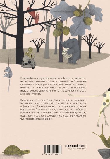 Handling time: 19 days В волшебном лесу всё изменилось. Мудрого, весёлого, находчивого сверчка словно подменили: он больше не стрекочет и не танцует. Никто не идёт к нему за советом, наоборот — теперь все звери стараются помочь ему. Ведь в голове у сверчка ни с того ни с сего поселилось... мрачное чувство.Великий сказочник Тоон Теллеген снова удивляет читателей: в его смешной, трогательной, абсурдной и философской сказке на этот раз спряталась история о депрессии. Сверчку и его друзьям предстоит победить мрачное чувство и наконец понять: что бы ни случилось, над миром всё равно взойдёт яркое солнце и мрачное чувство навсегда исчезнет!