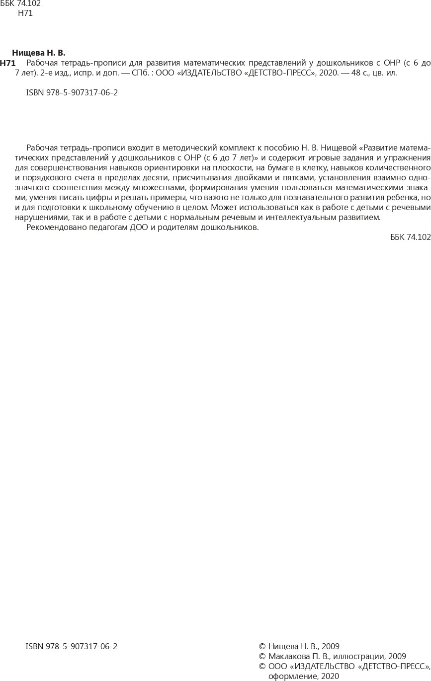 Handling time: 19 days Рабочая тетрадь-прописи входит в методический комплект к пособию Н. В. Нищевой "Развитие математических представлений у дошкольников с ОНР (с 6 до 7 лет)" и содержит игровые задания и упражнения для совершенствования навыков ориентировки на плоскости, на бумаге в клетку, навыков количественного и порядкового счета в пределах десяти, присчитывания двойками и пятками, установления взаимно однозначного соответствия между множествами, формирования умения пользоваться математическими знаками, умения писать цифры и решать примеры, что важно не только для познавательного развития ребенка, но и для подготовки к школьному обучению в целом.Может использоваться как в работе с детьми с речевыми нарушениями, так и в работе с детьми с нормальным речевым и интеллектуальным развитием.Рекомендовано педагогам ДОО и родителям дошкольников.2-е издание, исправленное и дополненное.