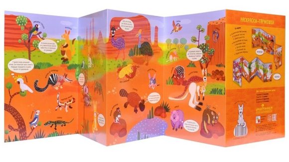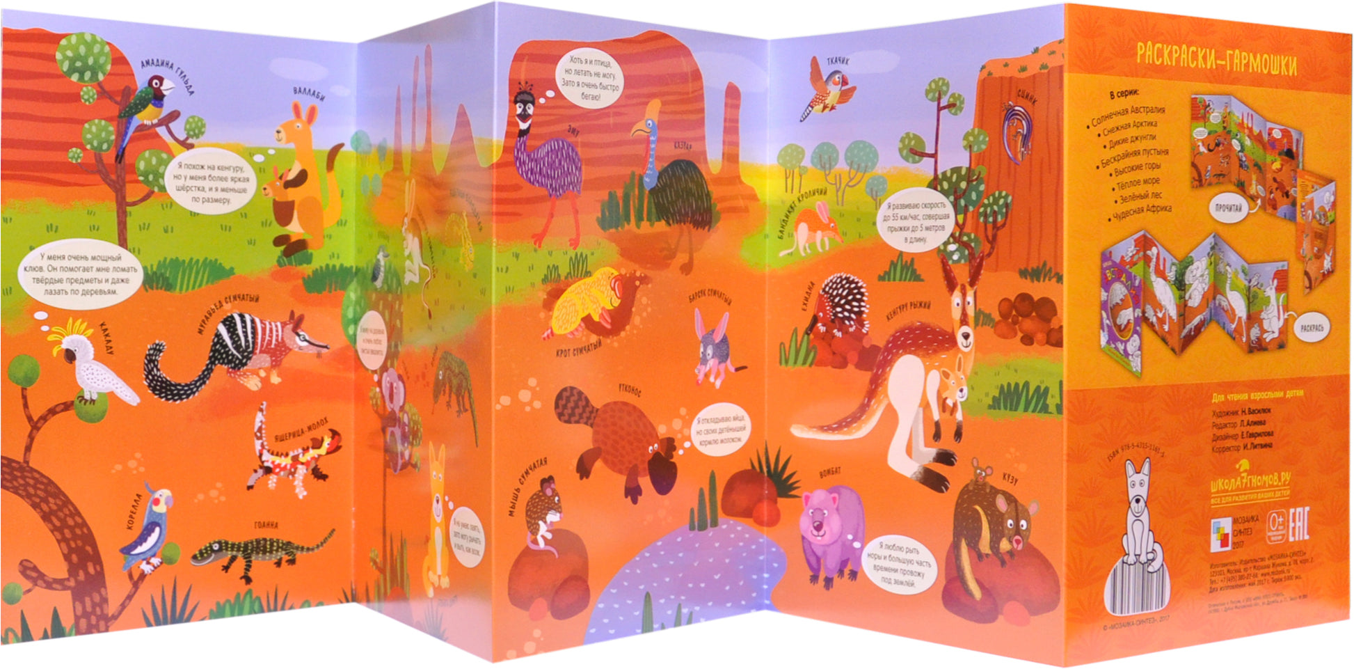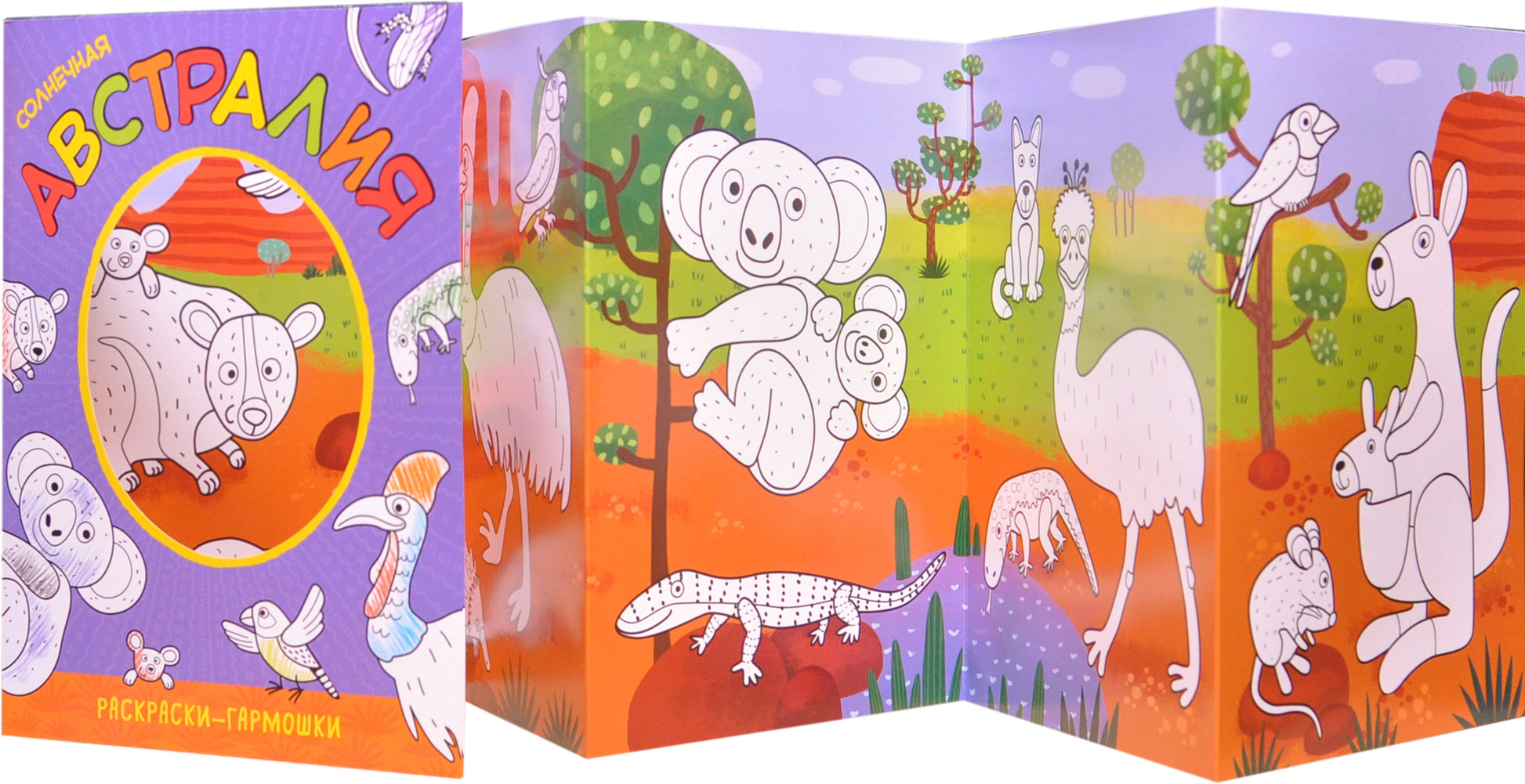 Необычная раскраска-гармошка "Солнечная Австралия" поможет не только весело и с пользой провести время, но и создать оригинальный плакат для украшения комнаты. Небольшая книжка-гармошка легко превращается в панораму с пейзажем австралийской полупустыни. Маленькому художнику предстоит раскрасить с помощью карандашей и фломастеров животных, обитающих в Австралии. Справиться с этой интересной, но непростой задачей ему поможет цветовая подсказка с множеством интересных фактов о мире живой природы на обороте. Занятия по книге "Солнечная Австралия" серии "Раскраски-гармошки" способствуют развитию творческих способностей, речи, мышления, а также расширению представлений об окружающем мире.