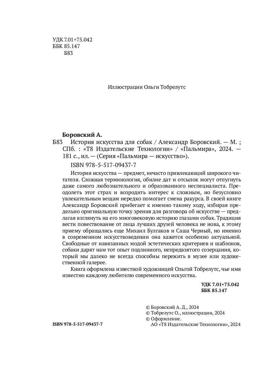 Handling time: 19 days Автор: Боровский Александр, «История искусства для собак»: История искусства — предмет, нечасто привлекающий широкого читателя. Сложная терминология, обилие дат и отсылок могут отпугнуть даже самого любознательного и образованного неспециалиста. Преодолеть этот страх и возродить интерес к сложным, но безусловно увлекательным вещам нередко помогает смена ракурса. В своей книге Александр Боровский прибегает к именно такому ходу, избирая предельно оригинальную точку зрения для разговора об искусстве - предлагая взглянуть на его многовековую историю глазами собак. Традиция вести повествование от лица лучших друзей человека не нова, к этому приему обращались еще Михаил Булгаков и Саша Черный, но именно в современном искусствоведении она кажется особенно актуальной. Свободные от навязанных модой эстетических критериев и шаблонов, собаки дарят нам тот опыт подлинного, непредвзятого созерцания, который мы далеко не всегда способны пережить в музее или художественной галерее.