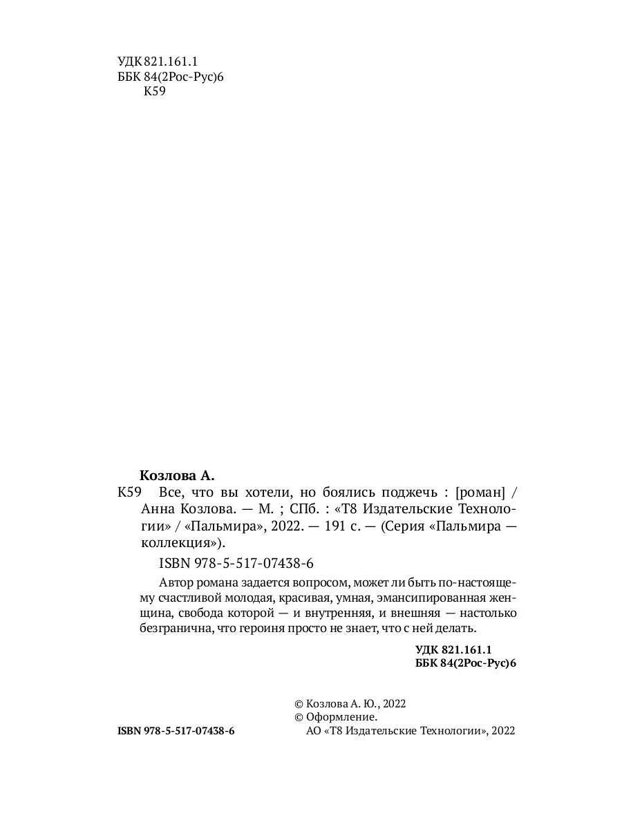 Handling time: 19 days Автор: Козлова Анна, «Все, что вы хотели, но боялись поджечь»: Автор романа задается вопросом, может ли быть по-настоящему счастливой молодая, красивая, умная, эмансипированная женщина, свобода которой — и внутренняя, и внешняя — настолько безгранична, что героиня просто не знает, что с ней делать.