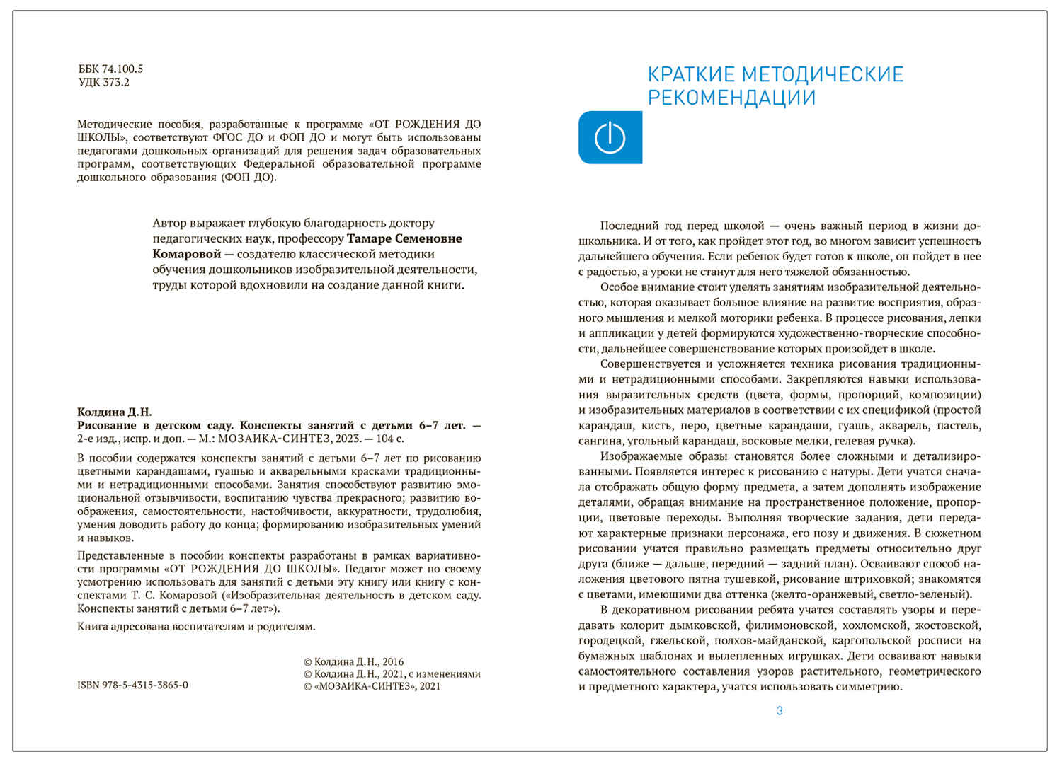 Handling time: 24 days Рисование в детском саду. Конспекты занятий с детьми. 6–7 лет. ФГОС. ФОП Пособие издано в рамках учебно-методического комплекта к программе «ОТ РОЖДЕНИЯ ДО ШКОЛЫ». В данном пособии представлены конспекты увлекательных занятий с детьми 6-7 лет по рисованию традиционными и нетрадиционными способами. На занятиях дети совершенствуют технику рисования, закрепляют навыки использования выразительных средств и изобразительных материалов в соответствии с их спецификой (простой карандаш, кисть, перо, цветные карандаши, гуашь, акварель, пастель, сангина,...