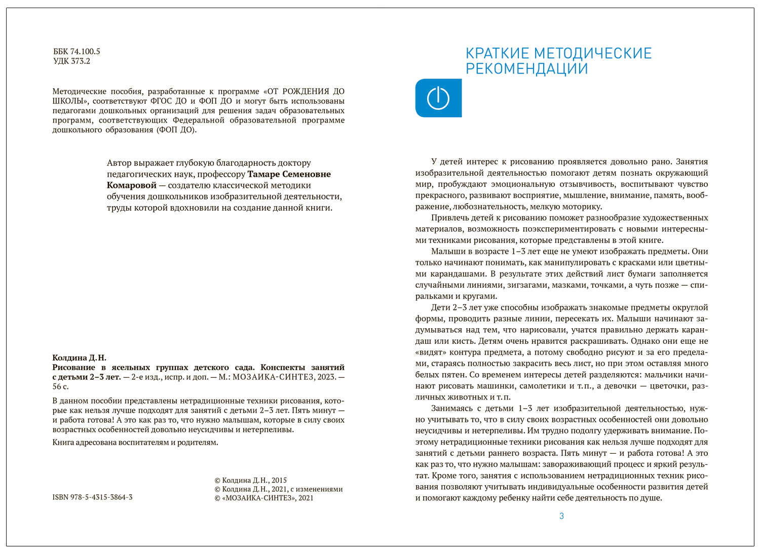 Handling time: 19 days Рисование в ясельных группах детского сада. Конспекты занятий с детьми 2–3 лет. ФГОС. ФОП Пособие издано в рамках учебно-методического комплекта к программе «ОТ РОЖДЕНИЯ ДО ШКОЛЫ». В пособии представлены конспекты занятий с детьми 2–3 лет по изодеятельности с использованием нетрадиционных техник рисования, которые позволяют учитывать индивидуальные особенности развития детей и помогают каждому ребенку найти себе деятельность по душе. Знакомство детей с новыми художественными материалами, инструментами и техниками развивает их творческое воображение....