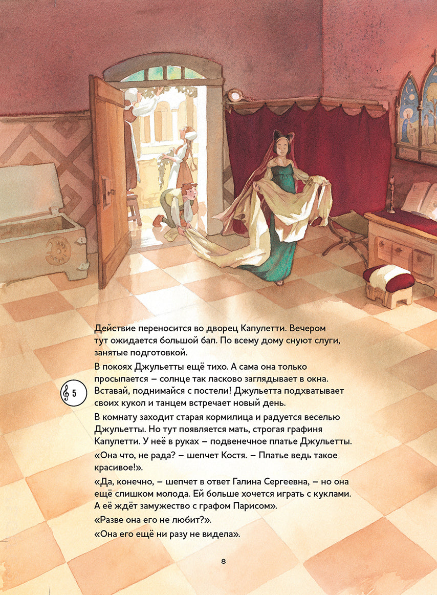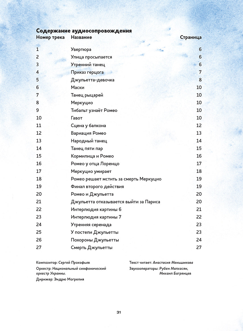 Трагическая история Ромео и Джульетты, написанная Уильямом Шекспиром в 1594–1595 годах, представлена в этой книге глазами юного ученика балетного класса Константина, которому выпадает удача принять участие в постановке балета на музыку Сергея Прокофьева. Двойная сюжетная линия книги и нежные акварельные иллюстрации художницы Анетте Блей позволят самым юным читателям познакомиться с сюжетом известнейшей трагедии без излишнего драматизма.
