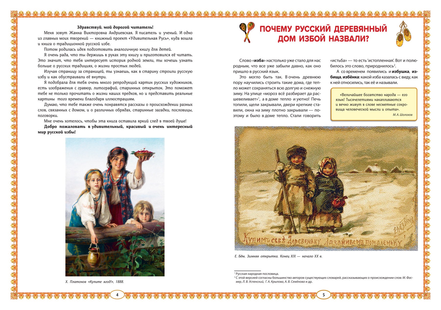 Повествование о строительстве, обустройстве избы - деревянного дома в деревне - дополнено интересными сведениями о русских традициях и обрядах, живописными иллюстрациями (репродукции картин русских художников-классиков, литографии, гравюры и др.).