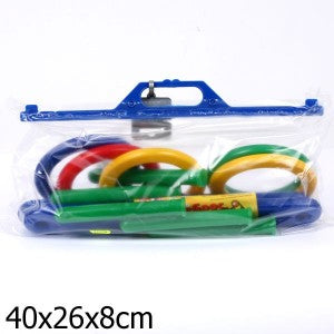 Handling time: 24 days Игрушка "Кольцеброс" развивает у детей мелкую моторику рук, ловкость и меткость, координацию движений и сноровку. Это весёлая и увлекательная игра, с которой можно тренироваться самостоятельно, а можно соревноваться с друзьями на счёт. До начала игры мишень-крестовину нужно установить на площадке. Начиная с небольшого расстояния, дальность броска следует постепенно увеличивать по мере возрастания опыта. На крестовинах имеются цифры, которые помогут почитать очки. В набор входят: мишень-крестовина, состоящая из двух частей, 5 столбиков высотой 17 см и 5 колец разного цвета. Игрушка изготовлена из пластмассы. Рекомендованный возраст: 3 года +
