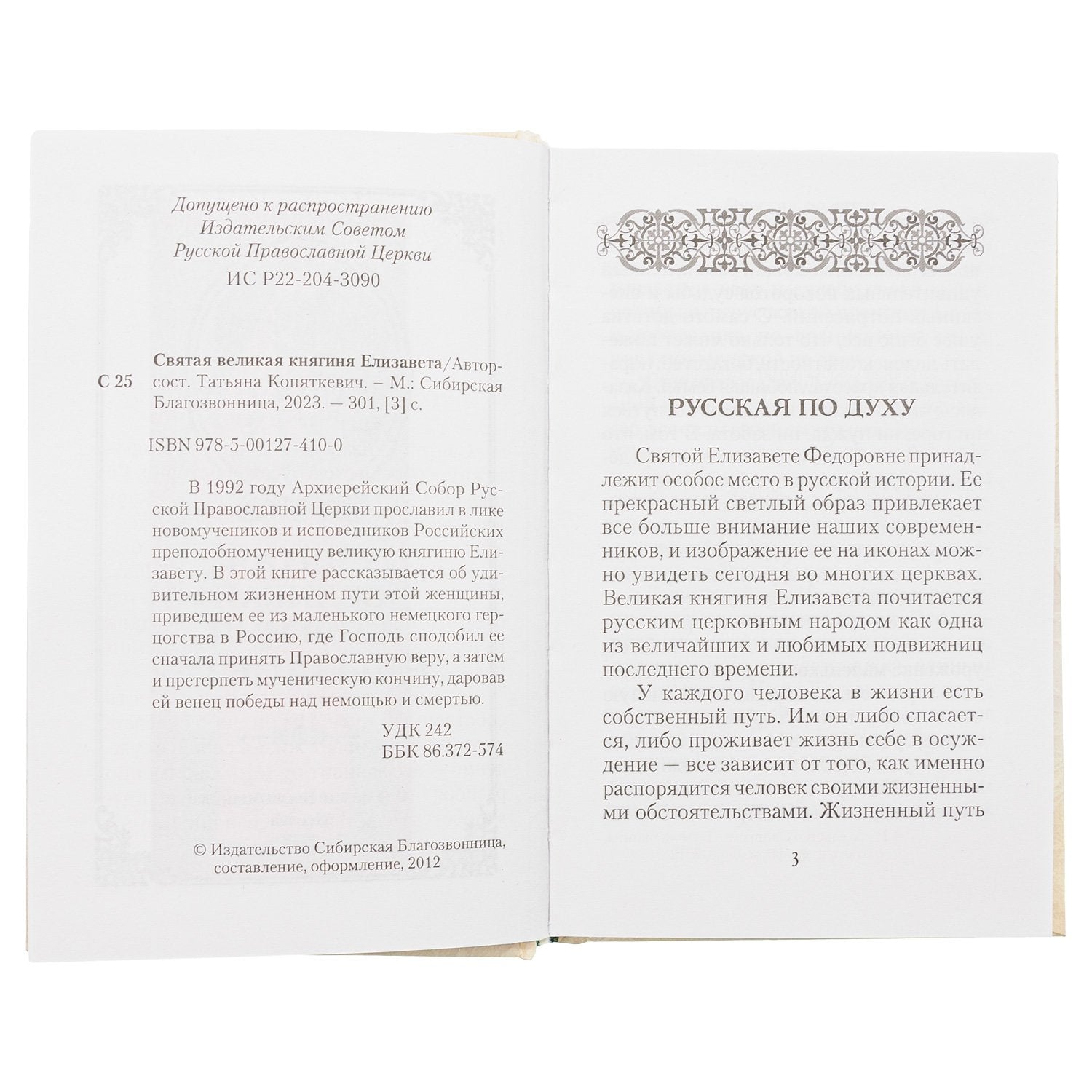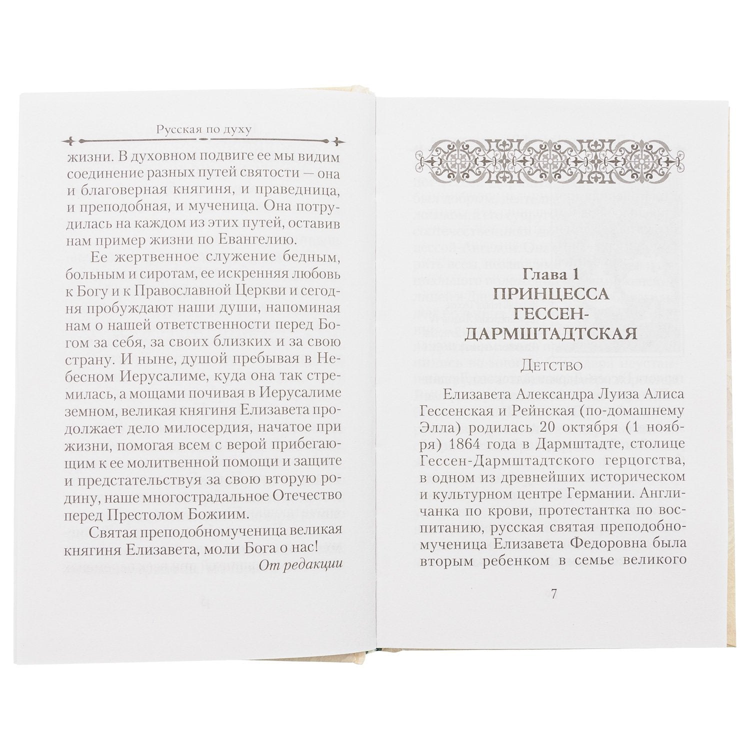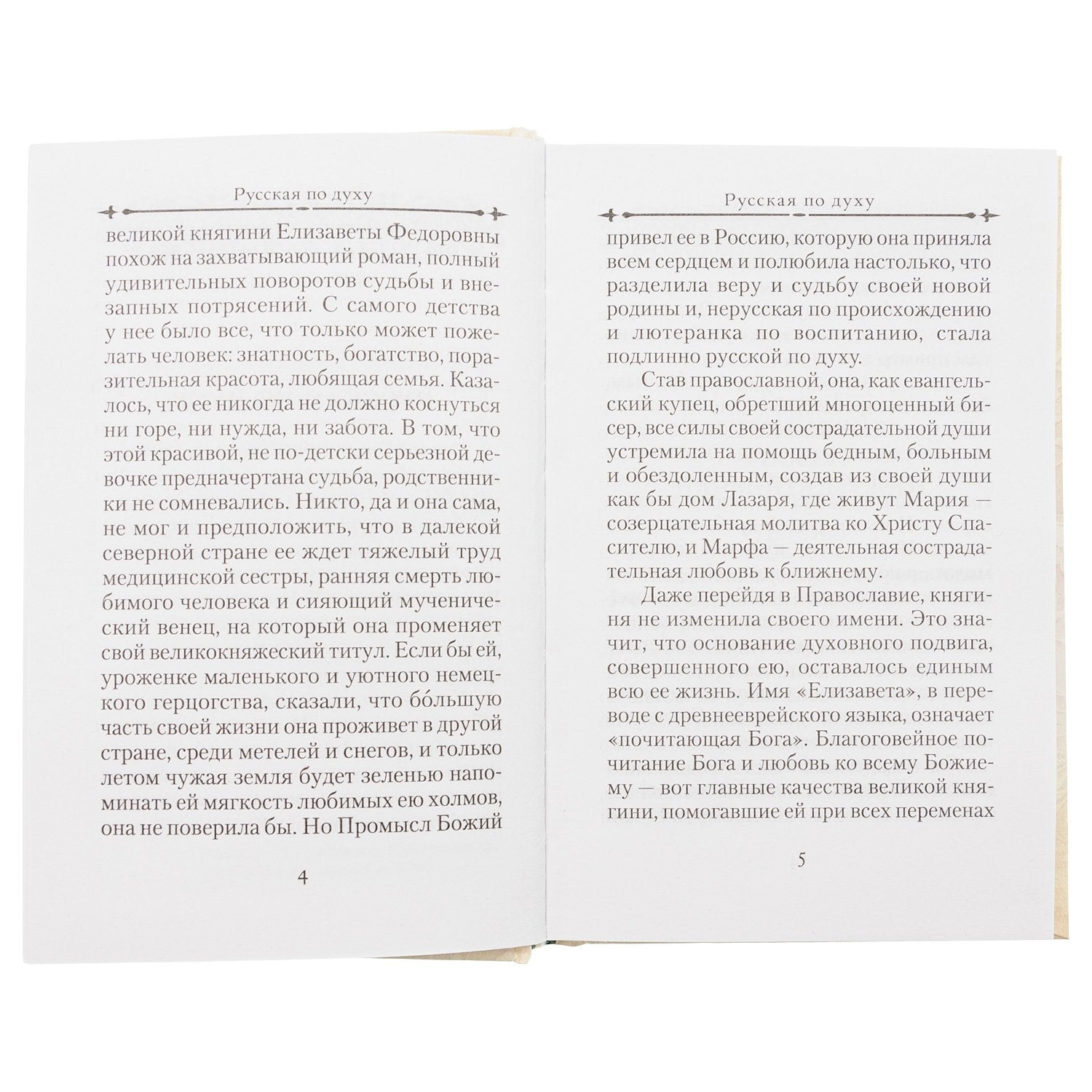Книга рассказывает об удивительной жизни этой женщины, приехавшей, выйдя замуж за великого князя Сергея Александровича Романова, из маленького немецкого герцогства Гессен-Дармштадт в Россию, где Бог сподобил ее сначала принять Православную веру, а затем и пострадать за неё от новых властителей России — безбожной советской власти.Святой Елизавете Федоровне принадлежит особенное место в русской истории. Немка по крови и протестантка по воспитанию, тем не менее она стала русской по духу, просияв мученической кончиной в лике святых новомучеников и исповедников Российских. Всем сердцем возлюбив свою новую родину — Россию, великая княгиня Елизавета разделила её веру и судьбу, исполнив до конца евангельскую заповедь: Претерпевший до конца спасется (Мф. 24, 13).