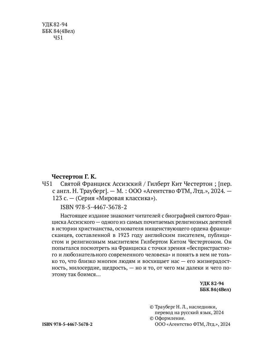 Handling time: 14 days Автор: Честертон Г.К., «Святой Франциск Ассизский»: Настоящее издание знакомит читателей с биографией святого Франциска Ассизского - одного из самых почитаемых религиозных деятелей в истории христианства, основателя нищенствующего ордена францисканцев, составленной в 1923 году английским писателем, публицистом и религиозным мыслителем Гилбертом Китом Честертоном. Он попытался посмотреть на Франциска с точки зрения «беспристрастного и любознательного современного человека» и понять в нем не только то, что близко многим людям и восхищает нас - его жизнерадостность, милосердие, щедрость, - но и то, от чего мы далеки и чего поэтому так боимся…