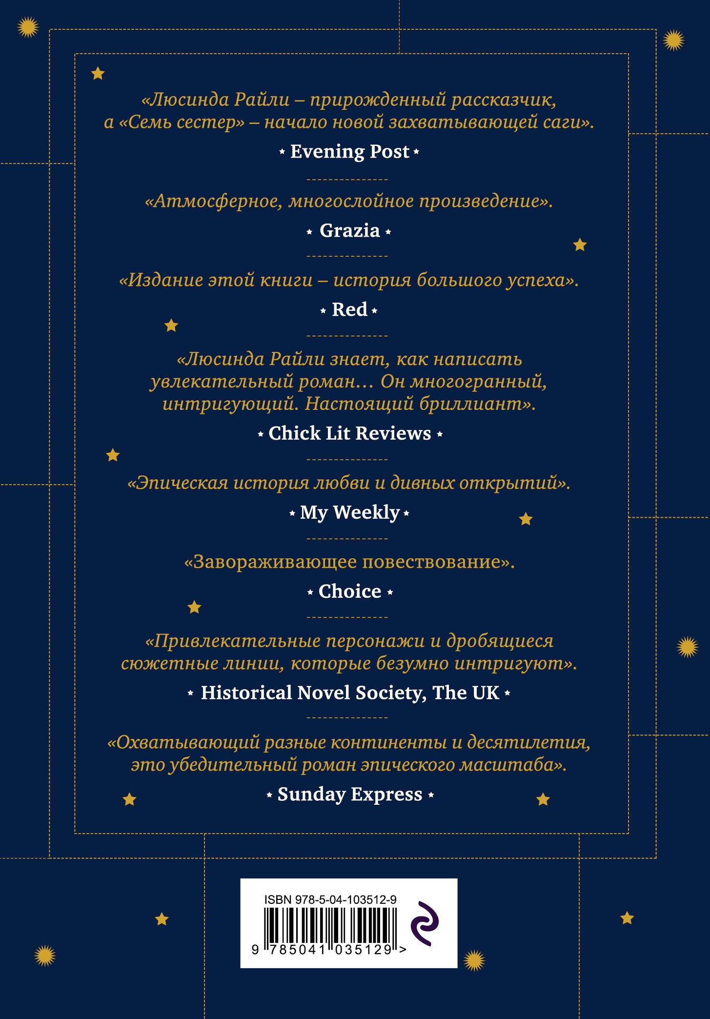 Handling time: 14 days Роман, изданный в 40 странах.Шорт-лист премии «Epic Novel» в категории «Романтическая проза».В мире продано более 15 000 000 экземпляров книг Люсинды Райли.«Люсинда Райли — прирожденный рассказчик, а "Семь сестер" — начало новой захватывающей саги». — Evening Post.«Атмосферное, эмоциональное, многослойное произведение». — Grazia«Издание этой книги — история большого успеха». — Red«Люсинда Райли знает, как написать увлекательный роман… Он многогранный, интригующий. Настоящий бриллиант». — Chick Lit Reviews«Люсинда создала эпическую историю о любви и удивительных открытиях». — My Weekly«Завораживающее повествование». — Choice«Привлекательные персонажи, любопытный отблеск эдвардианского общества и дробящиеся сюжетные линии, которые безумно интригуют». — Общество исторических романов (Historical Novel Society, The UK)«Охватывающий разные континенты и десятилетия, это убедительный роман эпического масштаба». — Sunday Express