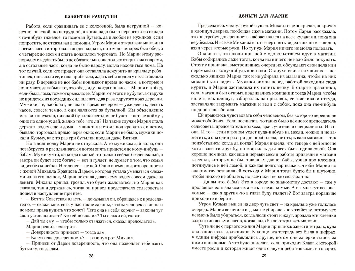В книгу замечательного русского писателя Валентина Григорьевича Распутина вошли его лучшие повести разных лет.«Деньги для Марии». У Марии, неопытного продавца деревенского магазинчика, обнаружена недостача. Тысяча - сумма огромная для ее семьи. Новость о недостаче быстро разносится по деревне, но никто не торопится предложить помощь. Никто не хотел бы оказаться на месте Марии, но большинству безразлично, как выпутается она из такой ситуации.«Живи и помни». В последний год войны в родную деревню возвращается Андрей, который дезертировал по дороге из госпиталя после ранения. О том, что Андрей вернулся, знает только один человек - жена Настя. Она вынуждена скрывать мужа даже от родных. Андрей теперь - вечный беглец, обречённый на одиночество.«Прощание с Матёрой». Действие повести происходит в 1960-х годах в деревне Матёре, расположенной посередине реки Ангары. В связи со строительством Братской ГЭС деревня должна быть затоплена, а жители переселены.«Дочь Ивана, мать Ивана». В основе сюжета лежит история женщины из сибирского города, застрелившей насильника своей несовершеннолетней дочери.Книга В.Г. Распутина «Прощание с Матёрой» символически стала 100-м томом популярной серии «Сибириада», выпускаемой издательством «Вече» с 2006 года.