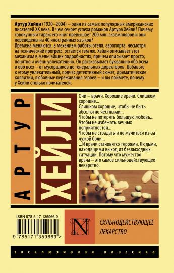 Что сделало Артура Хейли настолько популярным, что заставляет миллионы людей снова и снова возвращаться к его произведениям? Все просто: во всех своих книгах он, точно под микроскопом, изучал самые разные профессиональные сообщества людей.…Банк, отель, аэропорт, газетная редакция, больница, самолет, полицейский участок, - Хейли заставляет читателя стать одним из сотрудников, одним из винтиков машины, составляющей единое целое.Его романы можно читать ради увлекательного острого сюжета, — но главное в них всегда люди. Люди, на месте которых мог бы оказаться каждый из нас. Их реакции. Их страсти, интриги, их любовь и ненависть, их эгоизм, мужество – и воля к жизни.Они — врачи. Хорошие врачи. Слишком хорошие...Слишком хорошие, чтобы не быть абсолютно честными...Чтобы не потерять большую любовь...Чтобы не избежать вечных неприятностей...Чтобы не страдать и не мучиться из-за чужой боли......И врачи становятся героями. Людьми, находящими выход из безвыходных ситуаций. Потому что мужество врача — это самое сильнодействующее лекарство.