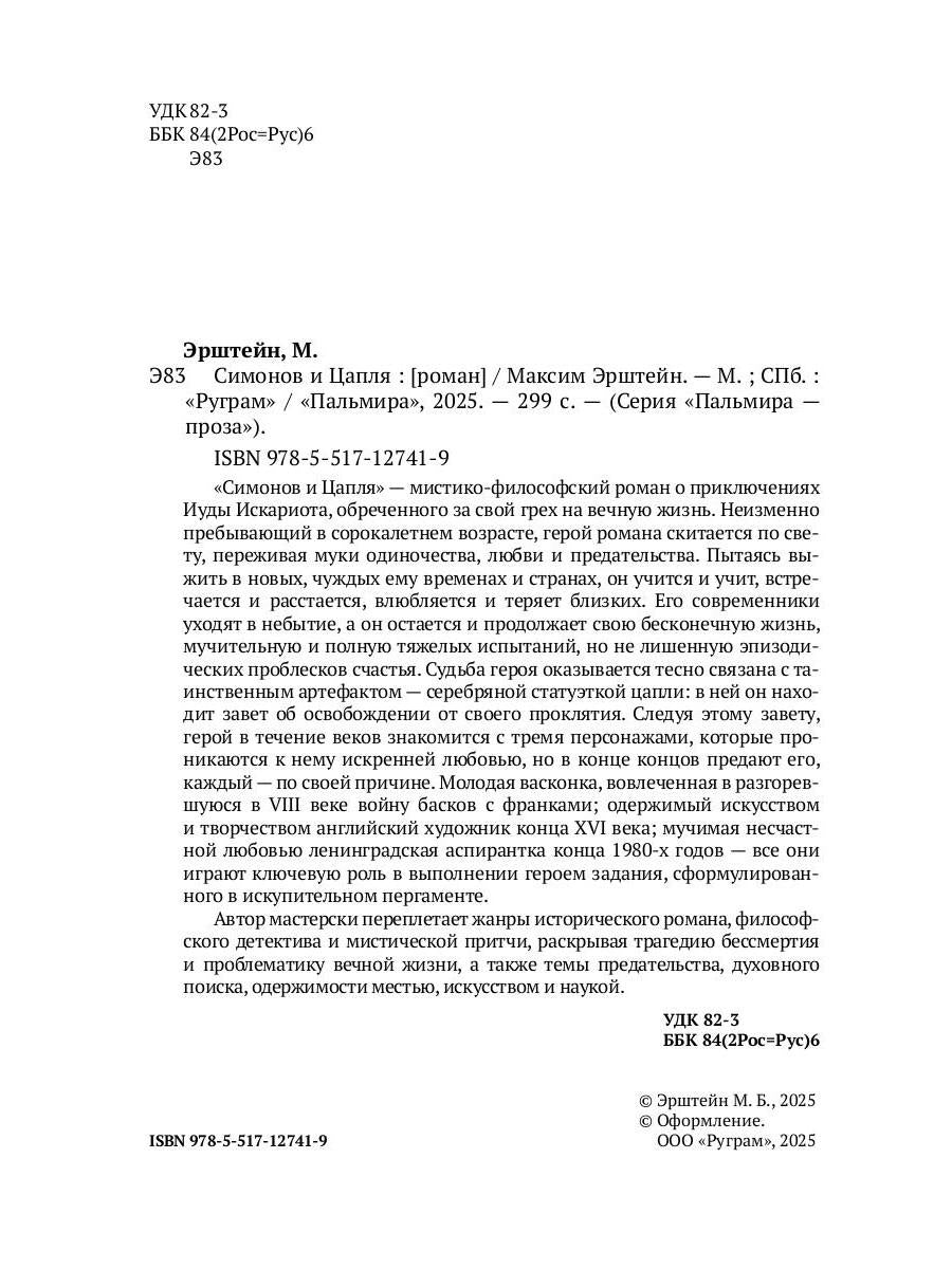 Handling time: 19 days Автор: Улыбышева Марина, «Симонов и Цапля: роман»: «Симонов и Цапля» - мистико-философский роман о приключениях Иуды Искариота, обреченного за свой грех на вечную жизнь. Неизменно пребывающий в сорокалетнем возрасте, герой романа скитается по свету, переживая муки одиночества, любви и предательства. Пытаясь выжить в новых, чуждых ему временах и странах, он учится и учит, встречается и расстается, влюбляется и теряет близких. Его современники уходят в небытие, а он остается и продолжает свою бесконечную жизнь, мучительную и полную тяжелых испытаний, но не лишенную эпизодических проблесков счастья. Судьба героя оказывается тесно связана с таинственным артефактом - серебряной статуэткой цапли: в ней он находит завет об освобождении от своего проклятия. Следуя этому завету, герой в течение веков знакомится с тремя персонажами, которые проникаются к нему искренней любовью, но в конце концов предают его, каждый - по своей причине. Молодая васконка, вовлеченная в разгоревшуюся в VIII веке войну басков с франками; одержимый искусством и творчеством английский художник конца XVI века; мучимая несчастной любовью ленинградская аспирантка конца 1980-х годов - все они играют ключевую роль в выполнении героем задания, сформулированного в искупительном пергаменте. Автор мастерски переплетает жанры исторического романа, философского детектива и мистической притчи, раскрывая трагедию бессмертия и проблематику вечной жизни, а также темы предательства, духовного поиска, одержимости местью, искусством и наукой.