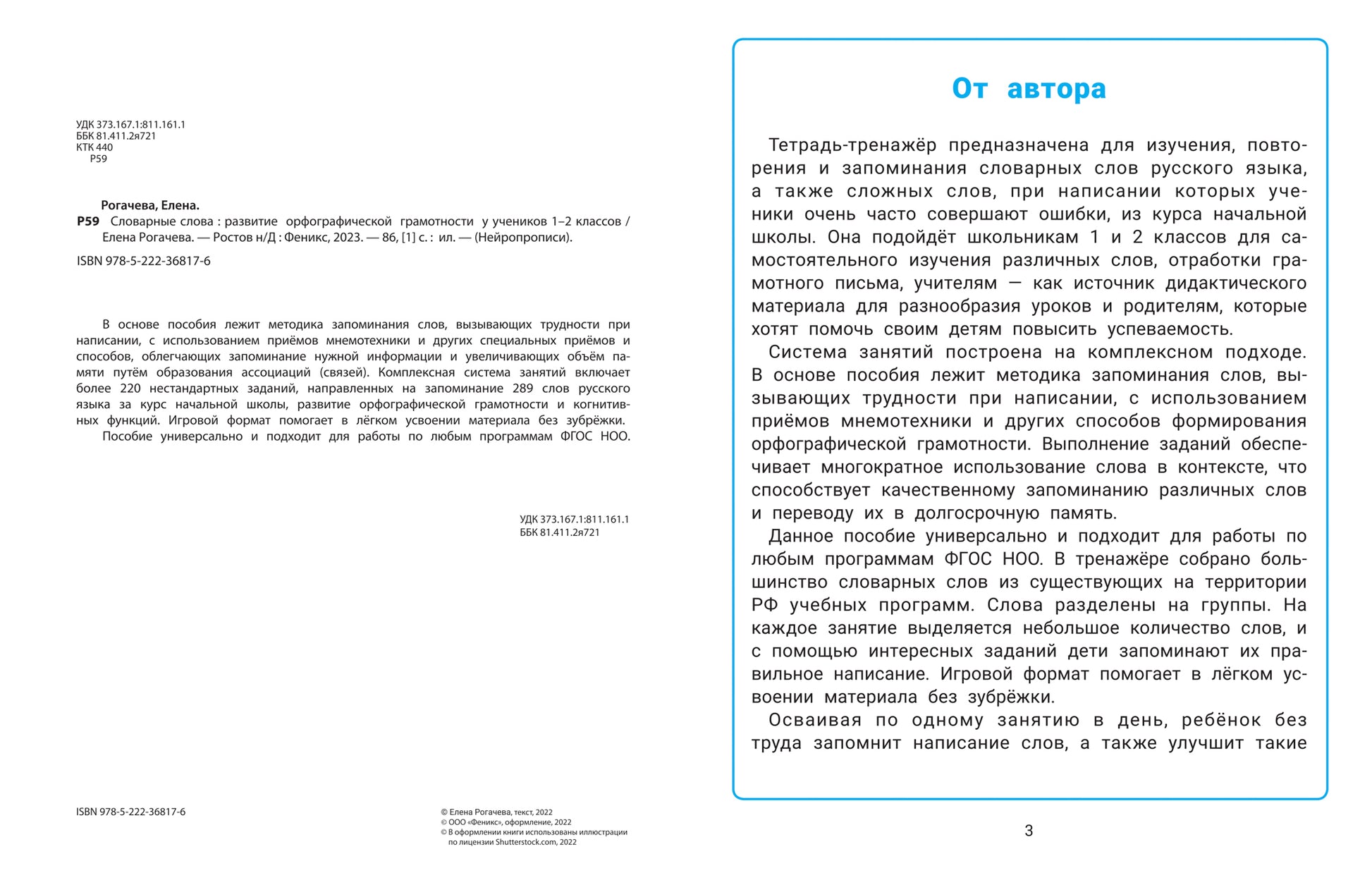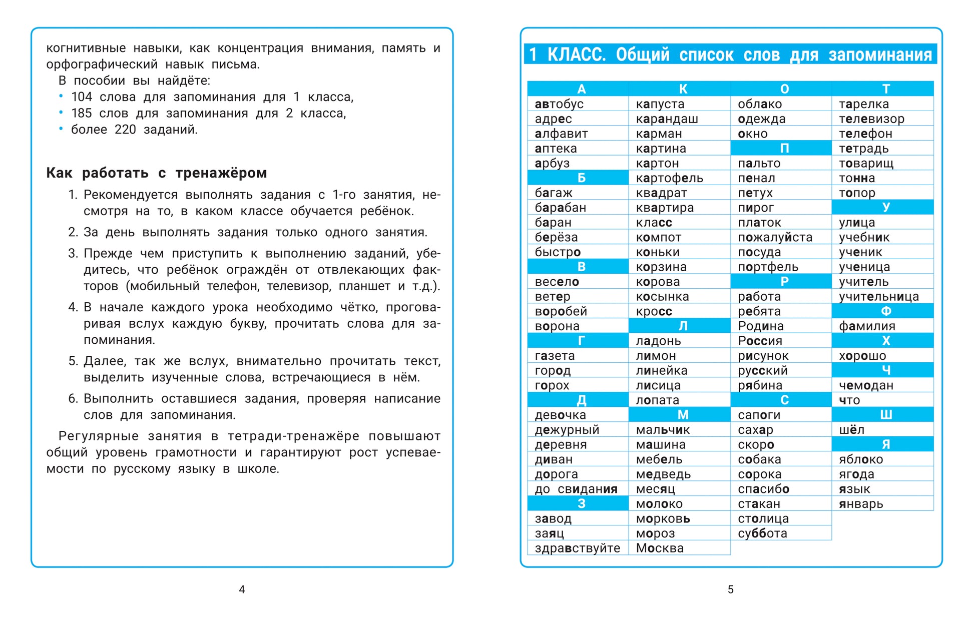 В основе пособия лежит методика запоминания слов, вызывающих трудности при написании, с использованием приёмов мнемотехники и других специальных приёмов и способов, облегчающих запоминание нужной информации и увеличивающих объём памяти путём образования ассоциаций (связей). Комплексная система занятий включает более 220 нестандартных заданий, направленных на запоминание 289 слов русского языка за курс начальной школы, развитие орфографической грамотности и когнитивных функций. Игровой формат помогает в лёгком усвоении материала без зубрёжки. Пособие универсально и подходит для работы по любым программам ФГОС НОО.