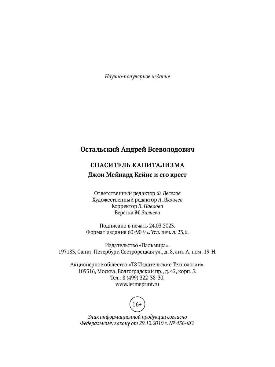 Handling time: 19 days Автор: Остальский А.В., «Спаситель Капитализма. Джон Мейнард Кейнс и его крест»: Андрей Остальский (р. 1953) - журналист, писатель, главный редактор Русской службы BBC (2000–2009), сотрудничал с изданиями Известия и The Financial Times, работал корреспондентом в Ираке, Йемене и Ливане. Остальский родился и вырос в Москве, но уже более 25 лет живет в Лондоне. Автор множества научно-популярных и художественных книг о путешествиях, истории и политике. Лауреат премии "Просветитель". Эта книга посвящена Джону Мейнарду Кейнсу (1883–1946), одному из самых значительных экономистов XX века. Часто говорят, что Кейнс предложил великий исторический компромисс - третий путь между капитализмом и социализмом. На самом деле он считал, что смысл его жизни - спасти капитализм, защитить свободу, рынок и демократию. Современники отмечали неординарный ход мысли Кейнса, его опережающую время "общую теорию", которая по сей день находится в центре внимания не только экономистов, но и всех, кто интересуется современной ситуацией в мире.