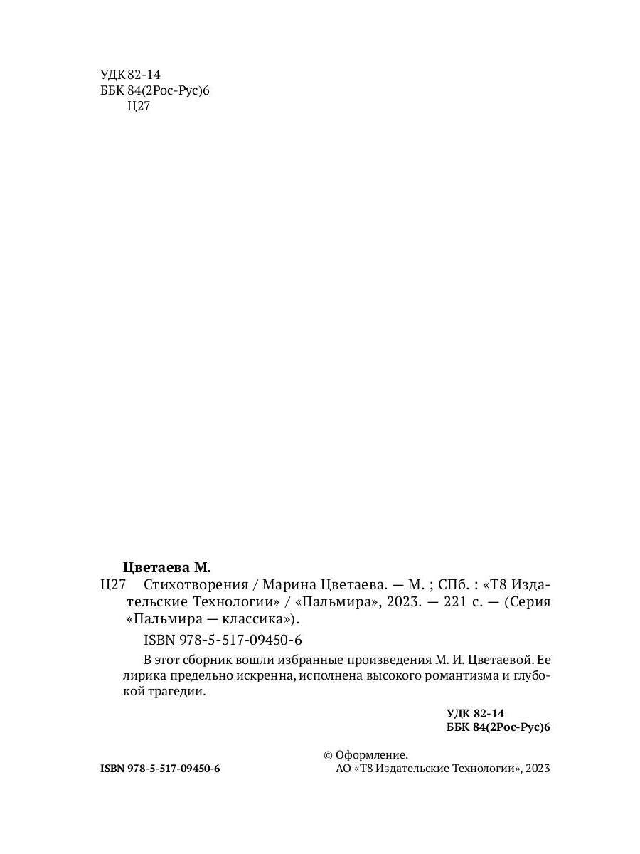 #ASTTD# Search Terms: Цветаева Марина Ивановна , Cvetaeva Marina Ivanovna , RUGRAM_Пальмира , RUGRAM_Palmira , Пальмира - Классика , Palmira - Klassika , 9785517094506 , 978-5-517-09450-6 , 1917756