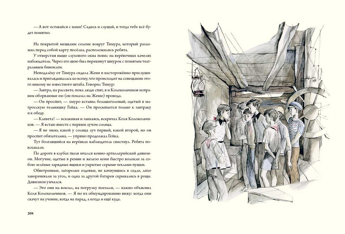 Handling time: 19 days Обычный деревенский мальчишка Димка, мечтающий добраться через охваченную войной страну к отцу в Петроград; запутавшийся и неуверенный в себе городской подросток Сергей; командир дачного отряда ребят Тимур… Каждый из них стал героем писателя Гайдара, потому что однажды совершил подвиг. И неважно, что значение этих подвигов несоизмеримо: Сергей не побоялся преградить путь врагам, Димка спас раненого, а Тимур помог девочке попрощаться с уходящим на фронт отцом. Иногда подвиг — просто поступок, но поступок, требующий убеждённости в своей правоте, находчивости, а иногда и мужества. У каждого из героев Аркадия Гайдара своя история, но их объединяет одно: они жили в трагическое и неоднозначное для страны время — от Гражданской войны и до начала Великой Отечественной. Суровость и противоречивость эпохи мастерски передал художник Владимир Гальдяев, создав по-особому сдержанный, почти моно­хромный визуальный образ гайдаровской прозы. Содержание: Р. В. С. Судьба барабанщика Тимур и его команда