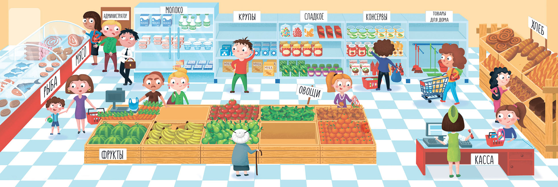 Как устроен супермаркет? Загляните внутрь и рассмотрите всё в деталях! На большой панорамной иллюстрации собраны разные локации, персонажи и ситуации. Предложите ребёнку дополнить панораму наклейками, а потом придумать и рассказать истории покупателей.