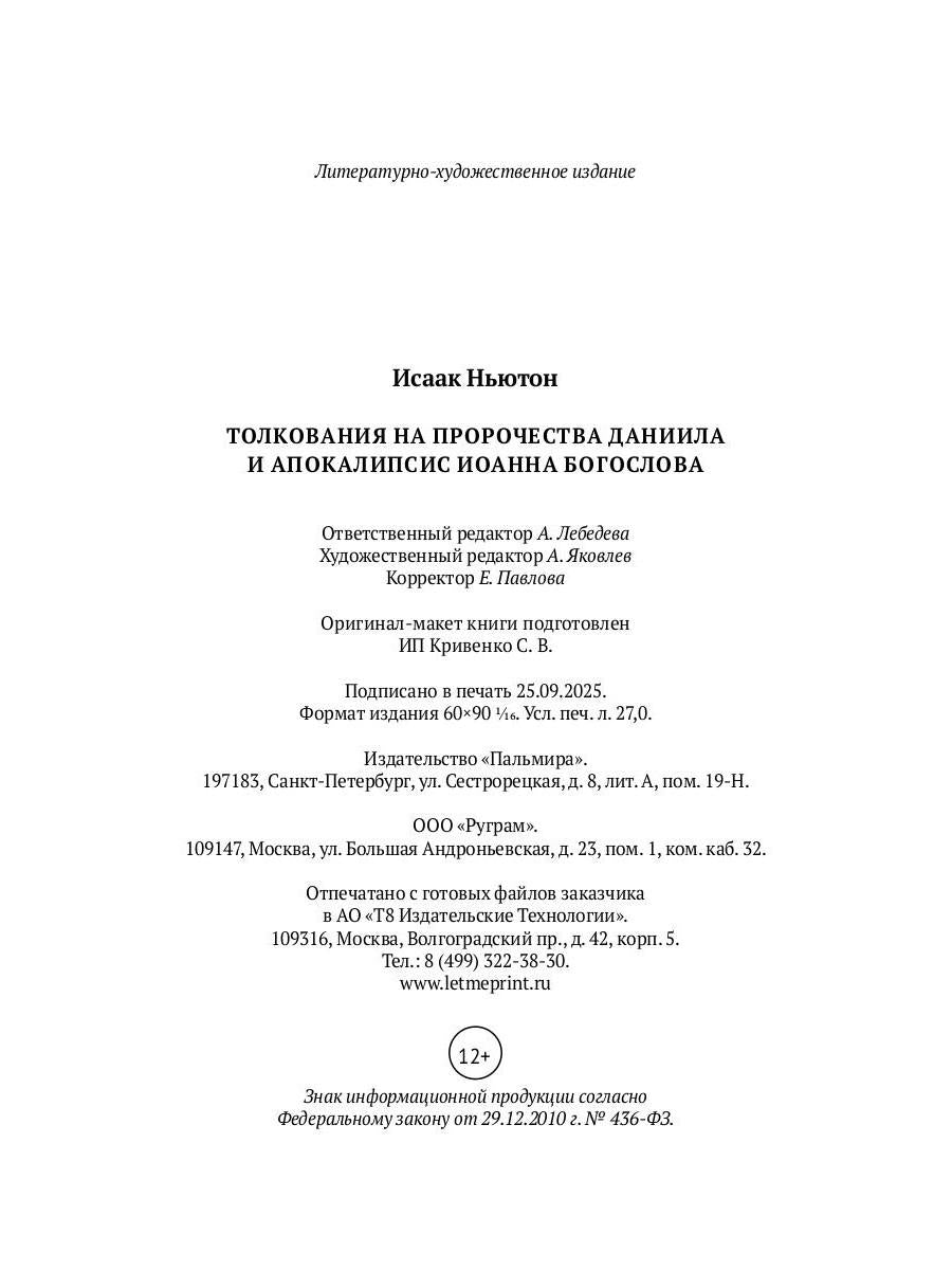Handling time: 14 days Автор: Ньютон Исаак, «Толкования на пророчества Даниила и Апокалипсис Иоанна Богослова»: В тени «Математических начал натуральной философии» и «Оптики» остались многочисленные богословские труды Ньютона, которые при жизни так и не были опубликованы. Среди них — «Толкования на пророчества Даниила и Апокалипсис Иоанна Богослова», в которых автор, один из отцов европейской науки, предстает как внимательный читатель Писания и наследник традиции герменевтов XVII века. Ньютон ищет в пророческих книгах внутреннюю логику истории, указывающую на скрытый порядок мироздания, столь же строгий, как законы движения небесных тел. Его размышления соединяют в себе науку и откровение, расчет и веру. В этих текстах нам предстает непривычный образ Ньютона — ученого-теолога, убежденного в том, что истина о будущем и смысл времени даны человеку в символах и видениях. Настоящее издание предлагает современный перевод историко-теологического труда Ньютона. Текст сопровождается комментариями, дополнениями и критическим разбором Владимира Рохмистрова — философа, писателя, автора книг истории и религии.