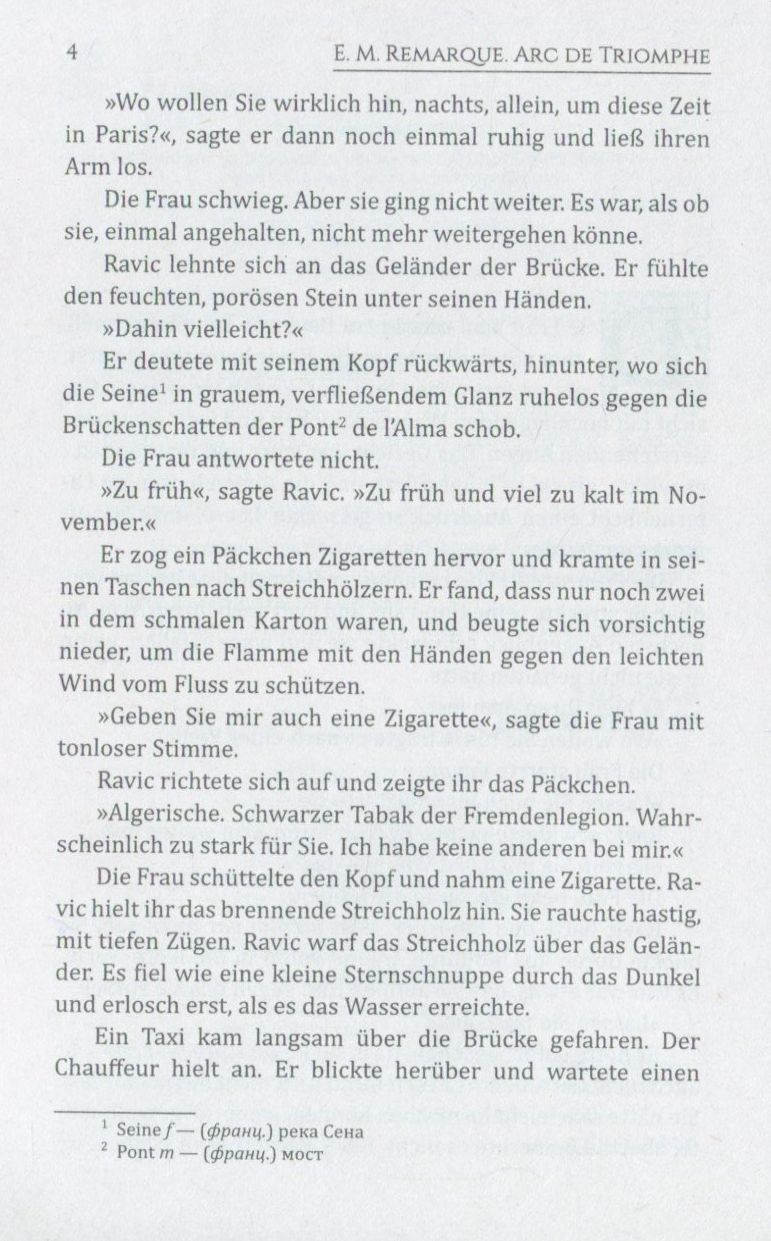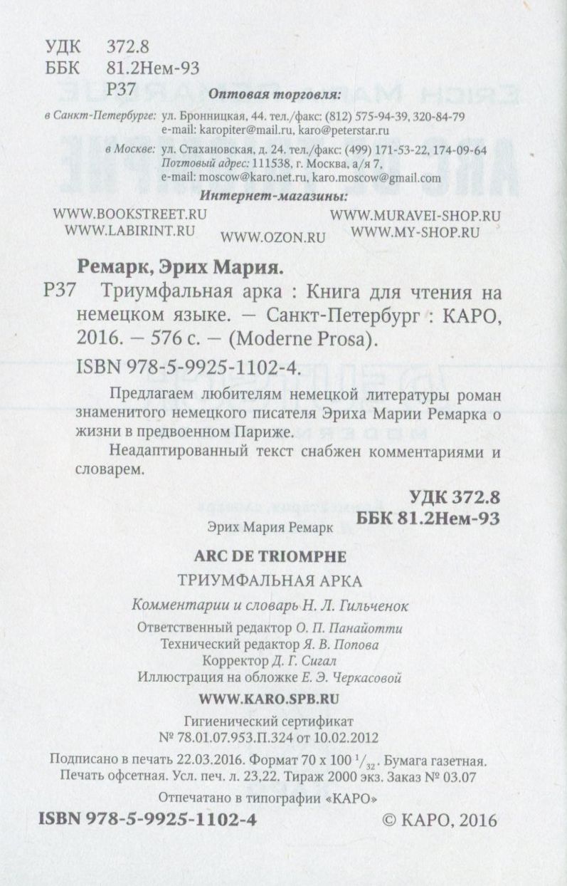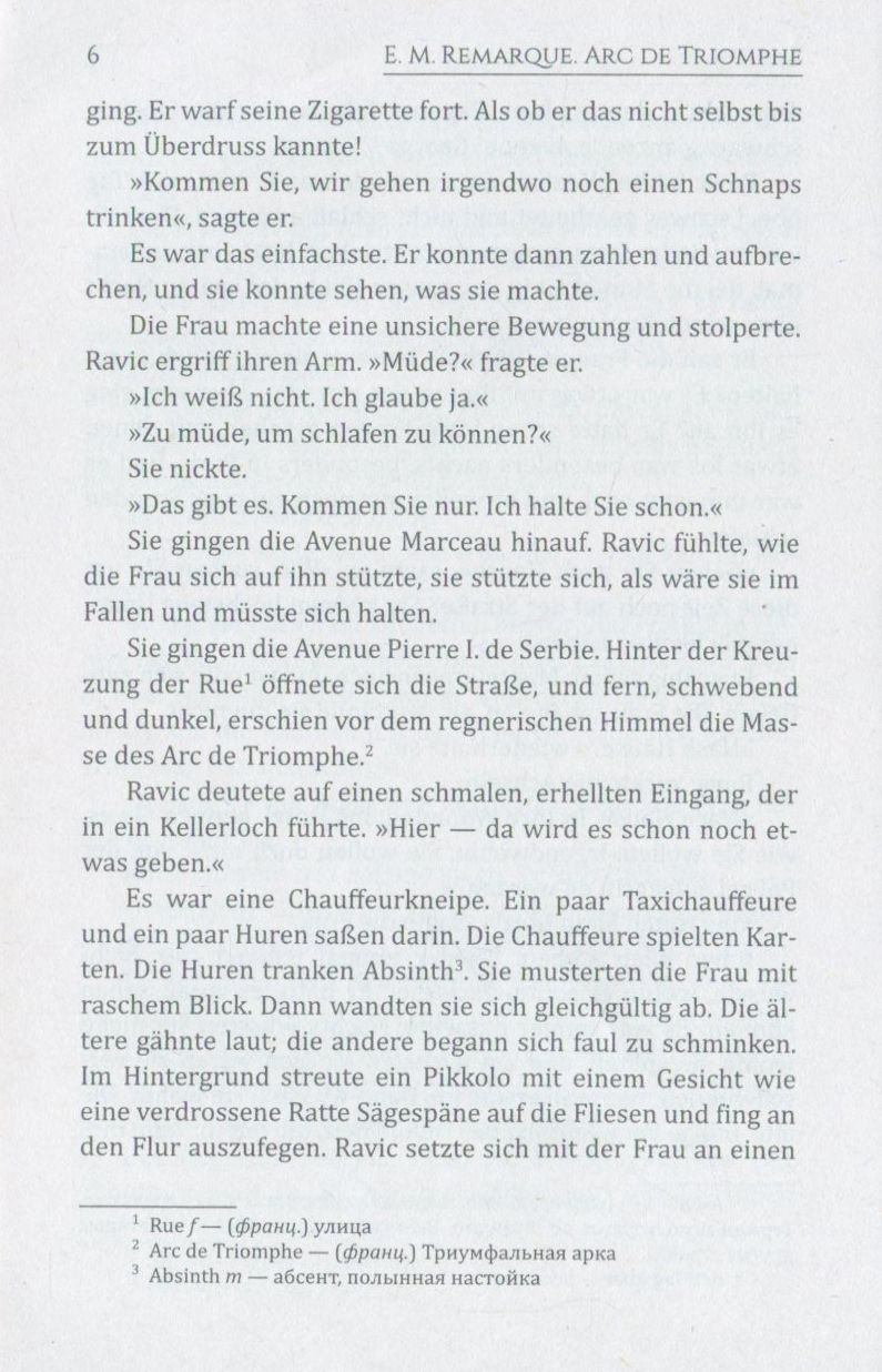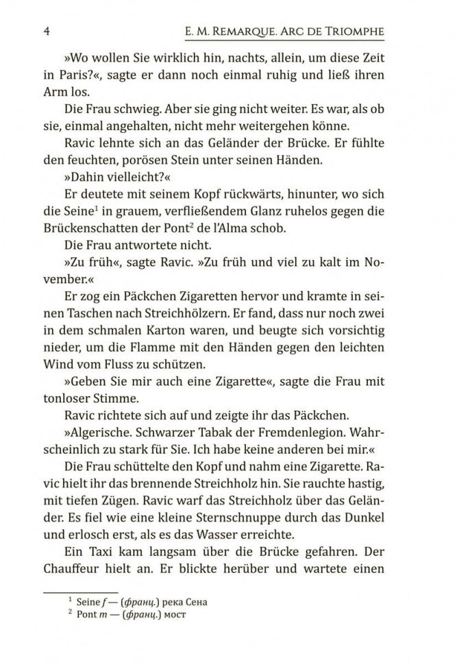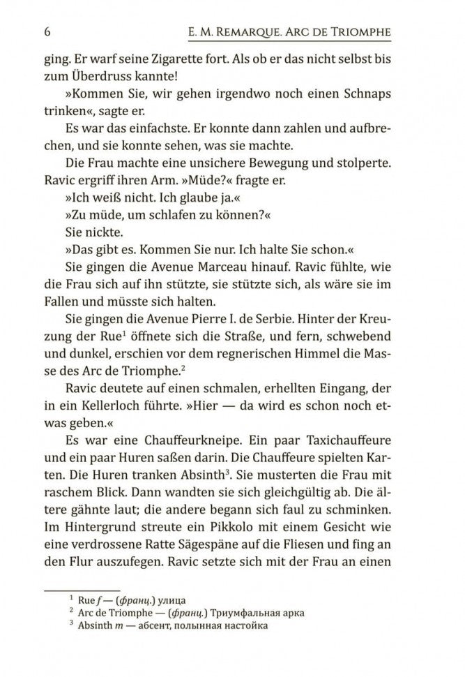 Handling time: 24 days «Триумфальная арка» — один из лучших романов Эриха Марии Ремарка. Париж у Ремарка — это не город влюбленных, а мрачный мир, приютивший бездомных со всей Европы, бежавших от фашистского режима. Переполненные гостиницы, приюты и притоны, эмигранты с документами и без, избегающие общения с полицией, перебивающиеся случайными заработками. Бывшие профессионалы и мастера своего дела превратились в ничто, в никому ненужных попрошаек. Главный герой романа, немецкий хирург Равик, — один из них. В книге приводится полный неадаптированный текст романа с комментариями и словарем.