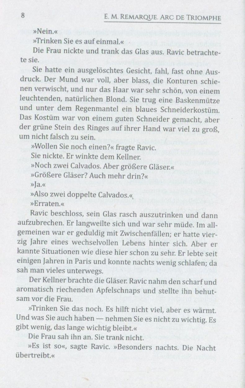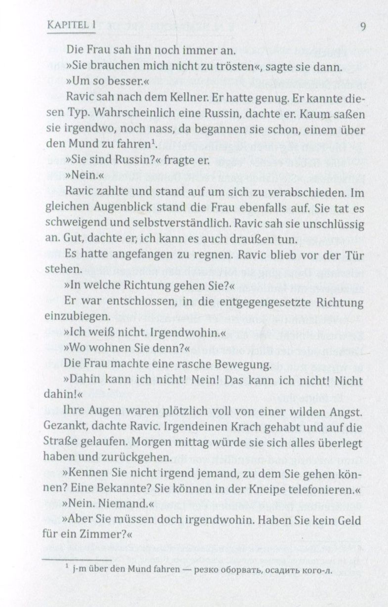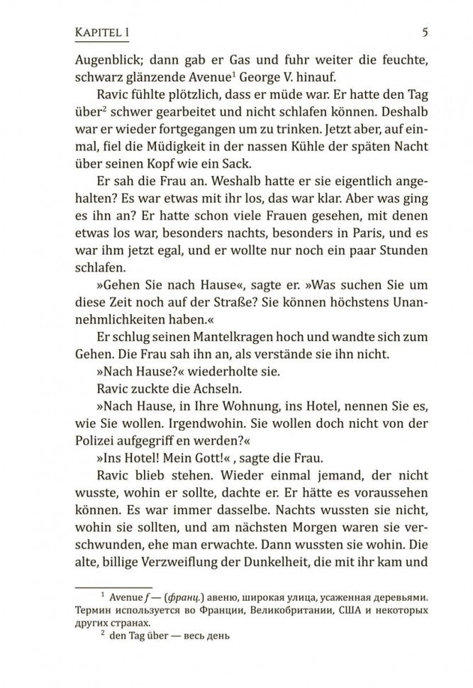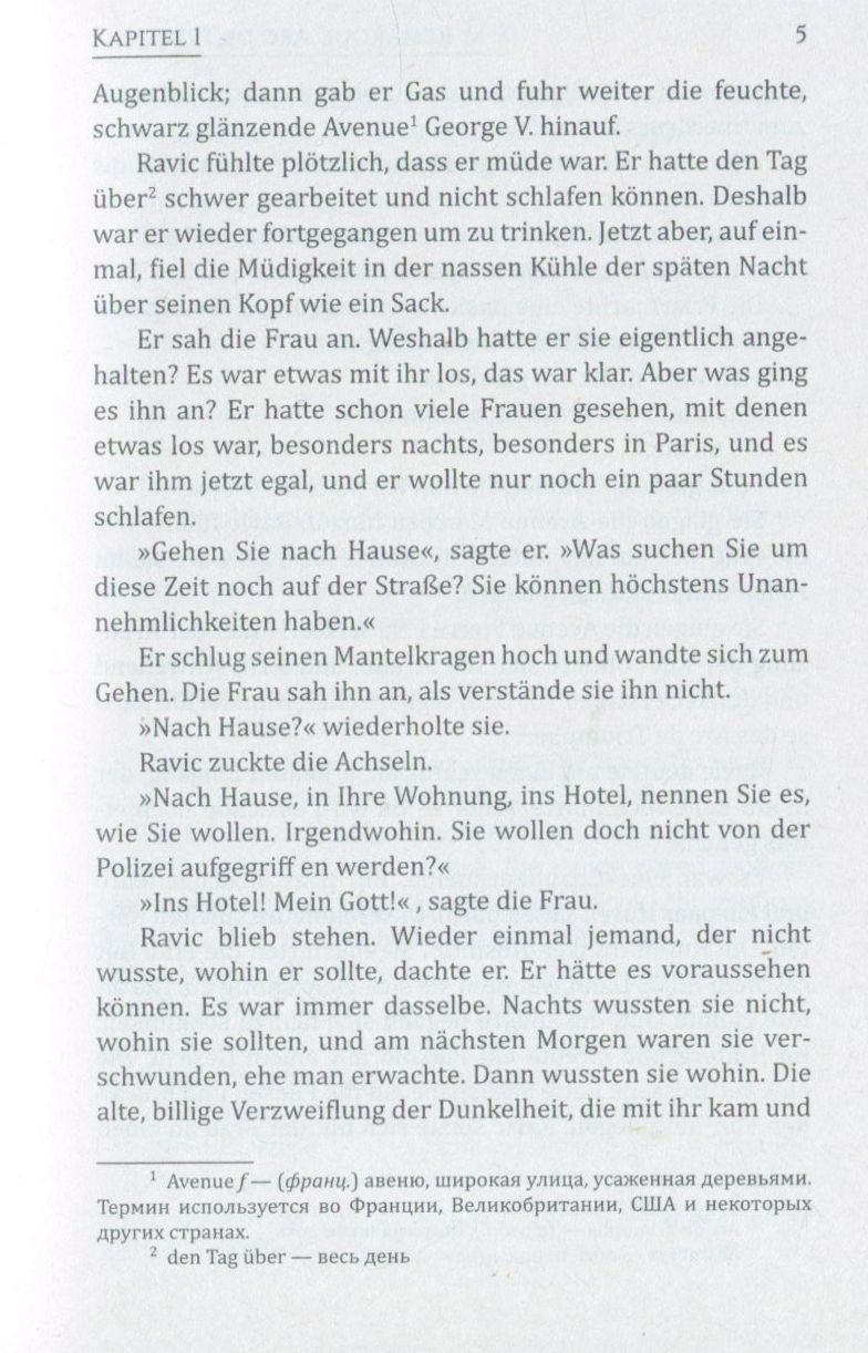 Handling time: 24 days «Триумфальная арка» — один из лучших романов Эриха Марии Ремарка. Париж у Ремарка — это не город влюбленных, а мрачный мир, приютивший бездомных со всей Европы, бежавших от фашистского режима. Переполненные гостиницы, приюты и притоны, эмигранты с документами и без, избегающие общения с полицией, перебивающиеся случайными заработками. Бывшие профессионалы и мастера своего дела превратились в ничто, в никому ненужных попрошаек. Главный герой романа, немецкий хирург Равик, — один из них. В книге приводится полный неадаптированный текст романа с комментариями и словарем.