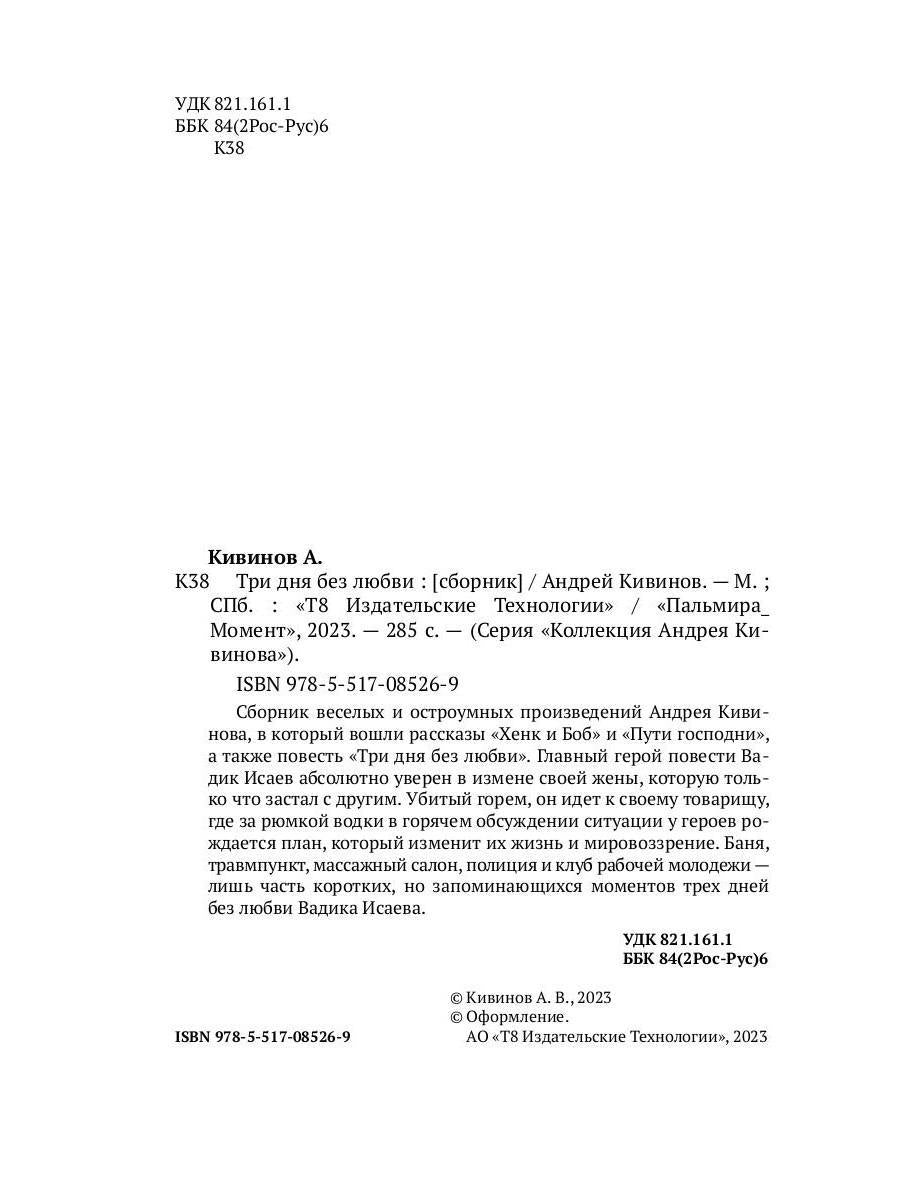Handling time: 19 days Автор: Кивинов А.В., «Три дня без любви: сборник»: Сборник веселых и остроумных произведений Андрея Кивинова, в который вошли рассказы "Хенк и Боб" и "Пути господни", а также повесть "Три дня без любви". Главный герой повести Вадик Исаев абсолютно уверен в измене своей жены, которую только что застал с другим. Убитый горем, он идет к своему товарищу, где за рюмкой водки в горячем обсуждении ситуации у героев рождается план, который изменит их жизнь и мировоззрение. Баня, травмпункт, массажный салон, полиция и клуб рабочей молодежи - лишь часть коротких, но запоминающихся моментов трех дней без любви Вадика Исаева.